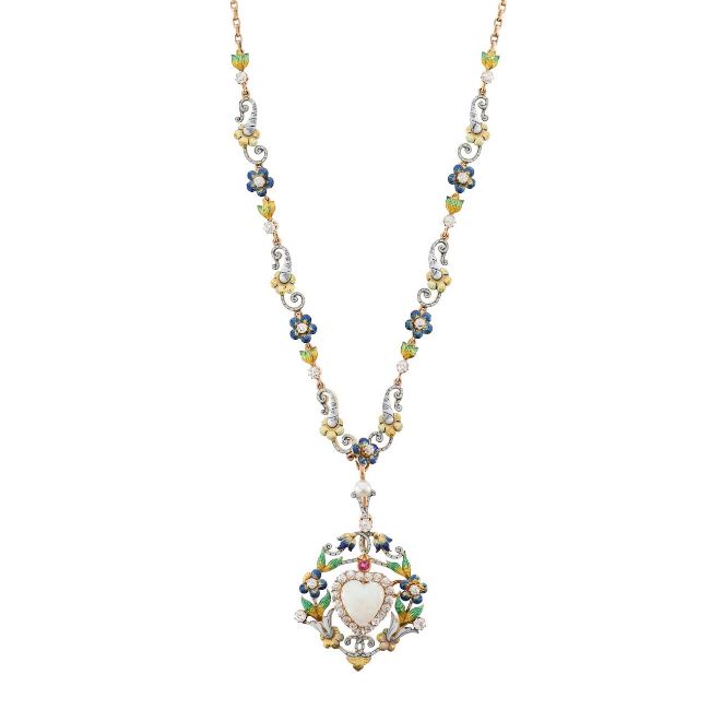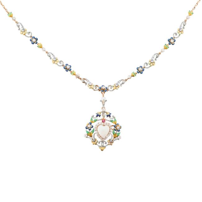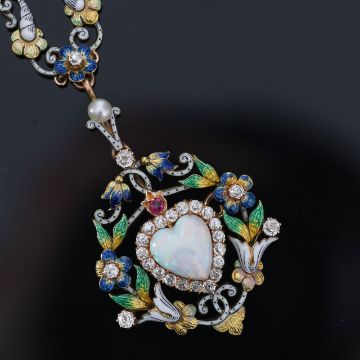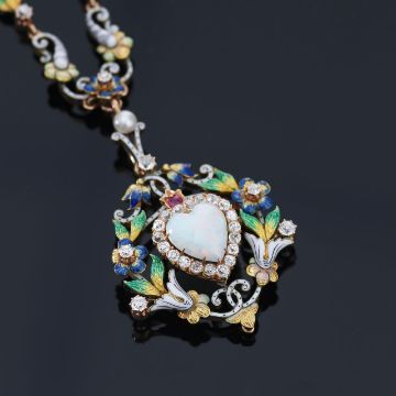 circa 1890, the detachable brooch/pendant centrally-set with a heart-shaped opal and old-brilliant-cut cluster to the openwork scrolling floral and foliate polychrome enamelled surround highlighted with old brilliant-cut diamonds and a circular-cut ruby, to the matching detachable 'ermine' enamel and pearl suspensory loop and necklace with filed belcher link yellow gold back chain