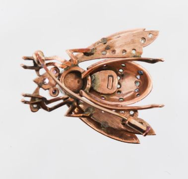 with enamel wings set with rose cut diamonds to tips and single cut diamond head, faceted ruby eyes, emerald cabochon thorax (untested) and a ruby, sapphire and emerald set abdomen