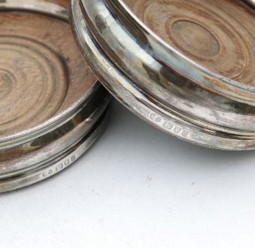 A pair of silver wine coasters,