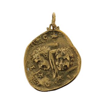 with 750 stamp and Italian control mark, depicting the carved faces of Gemini twin in the form of a medal with the words GEMELLI embossed to the border plain textured reverse and suspension loop