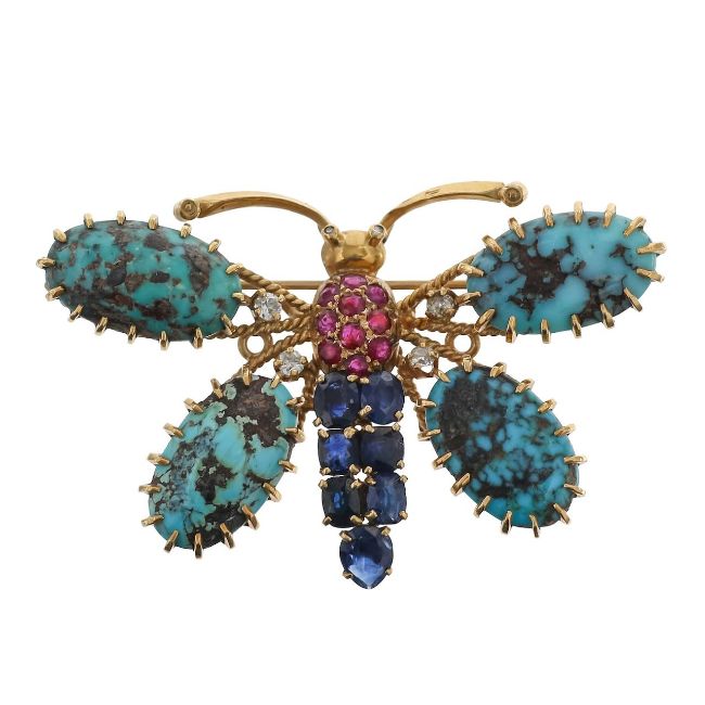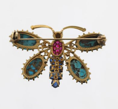 with sapphire and ruby set body, diamond eyes, natural turquoise wings with old cut diamond detail, to reverse a rope-work frame with the eagle head French control mark, later added brooch pin