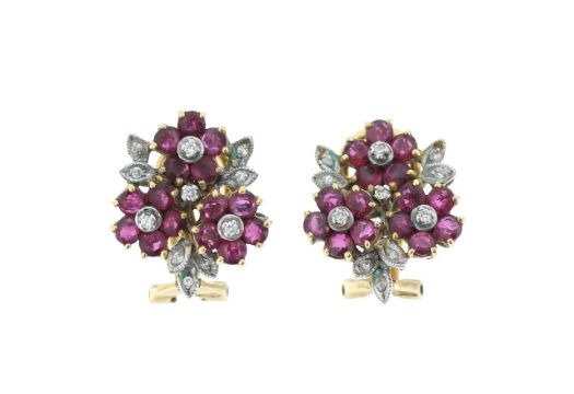 A pair of ruby and diamond cluster earrings