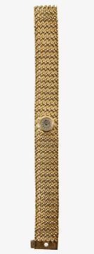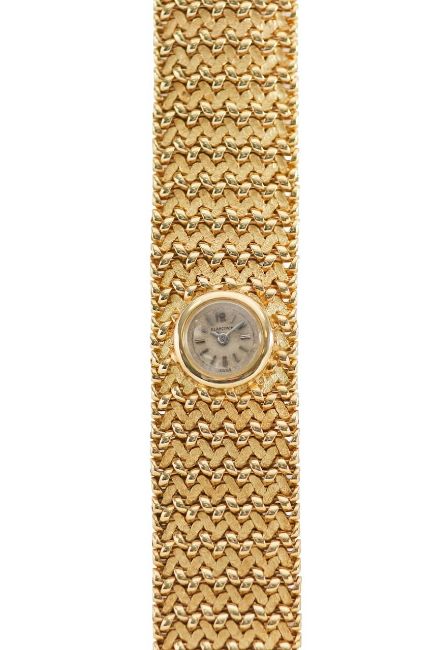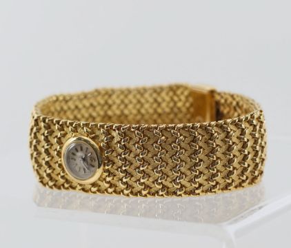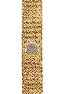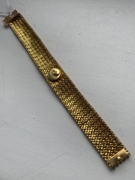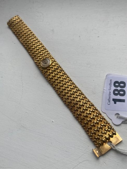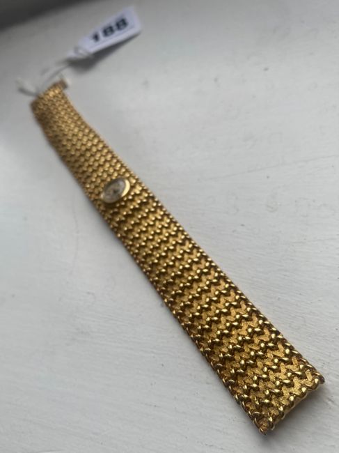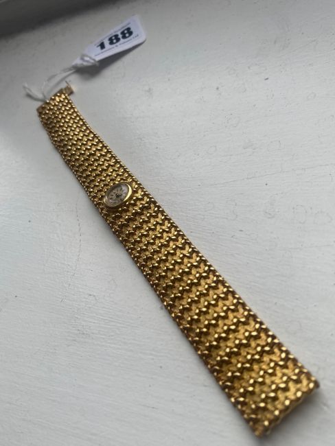 A Blancpain lady's 18k gold manual wind bracelet wristwatch the champagne coloured dial with baton numerals, with wide fancy link basket weave link bracelet, concealed backwind movement, in retailers boxCondotion: winds and ticks, movement has not been tested, not guaranteed.Dimensions: weight approx. 66g, length 19cm