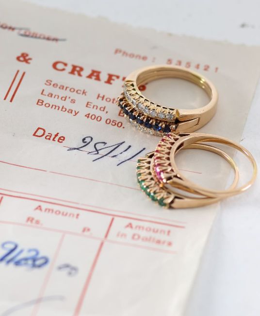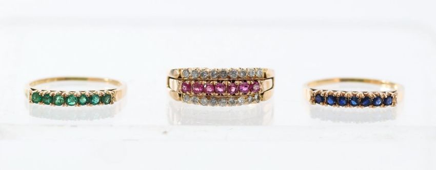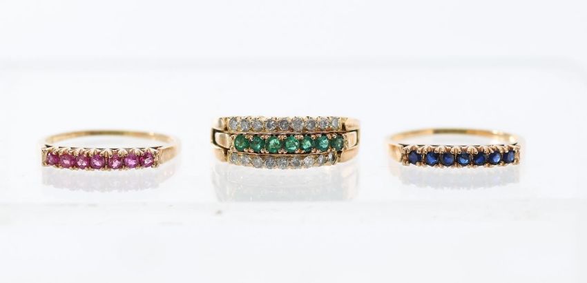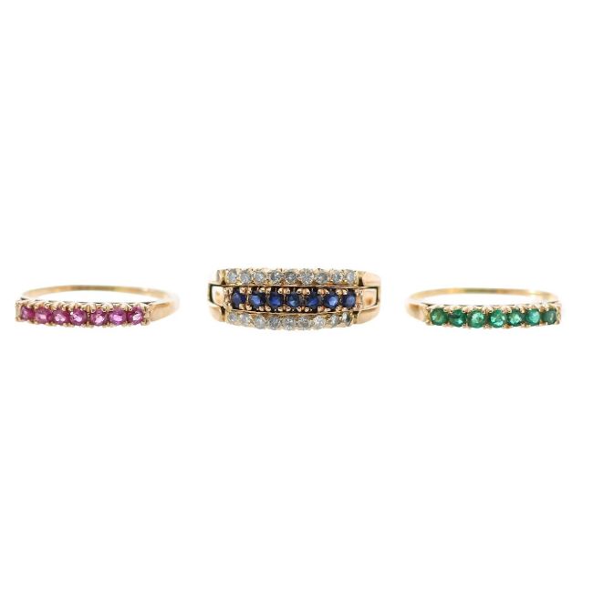 A diamond ruby sapphire and emerald stacking interchanging rings