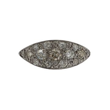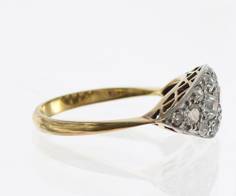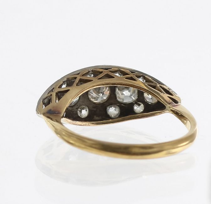 featuring old cut diamonds grain set across a marquise-shaped panel of white metal to a raised knife edge band stamp 18ct
