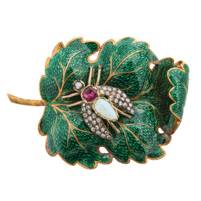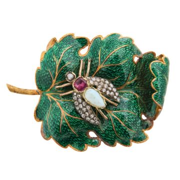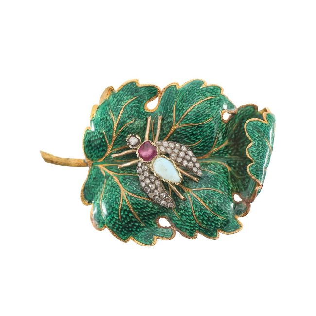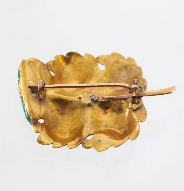 Condition: The enamel is good and generally in fine condition on the body of the leaf, on the underside and around the edges there is minimal wear. Repaired clasp.