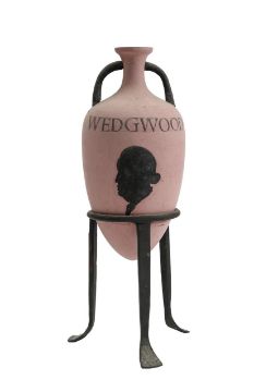 a pale pink painted terracotta amphora inscribed 'Wedgwood', with a profile silhouette, raised on a metal tripod stand, unsigned
