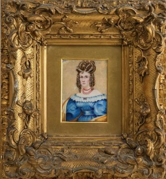 mid-19th century, half-length, depicted with elaborate ringlets, wearing a white lace and blue silk dress, rectangular gilt mount, gilt and gesso framed