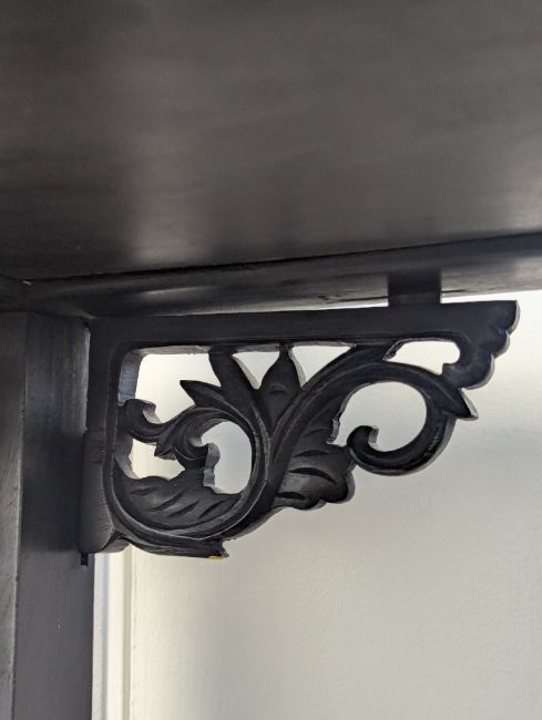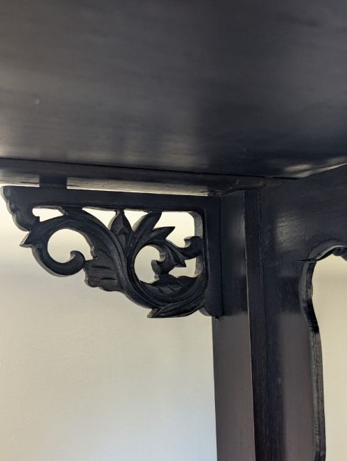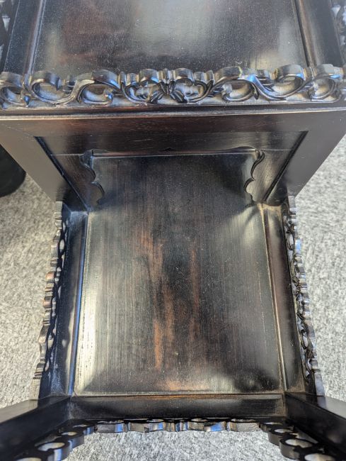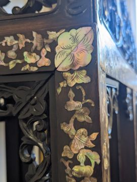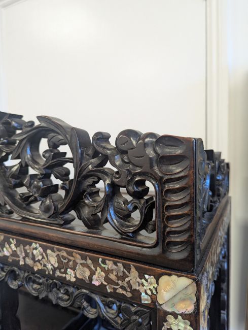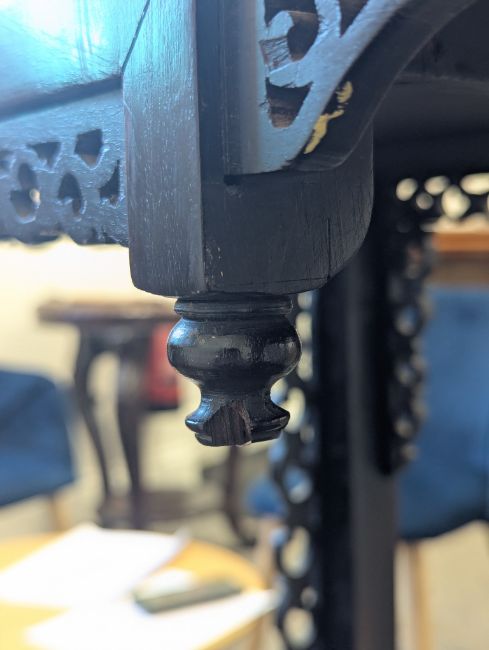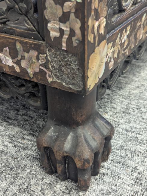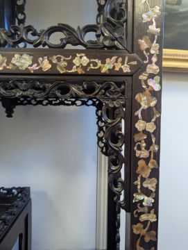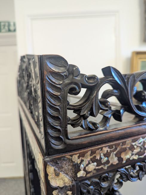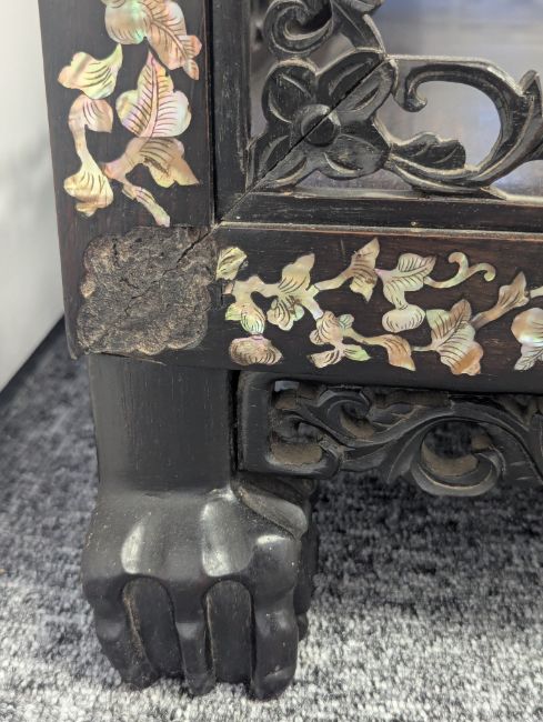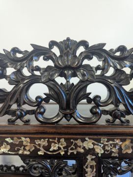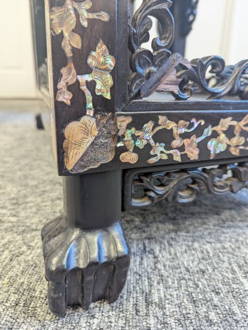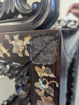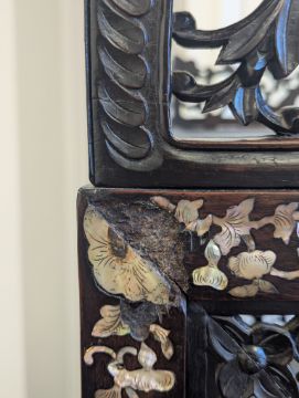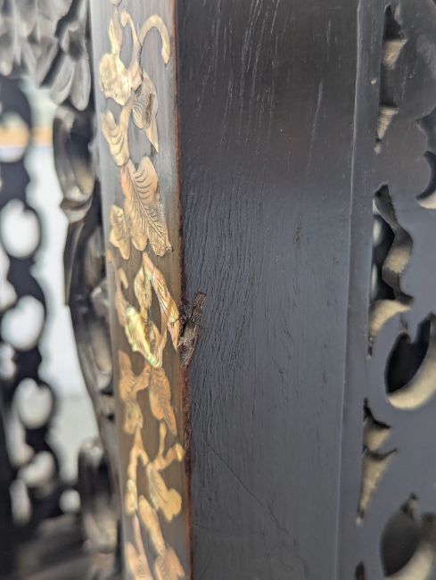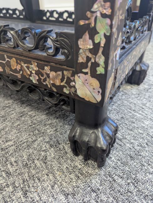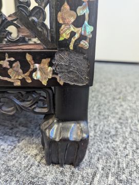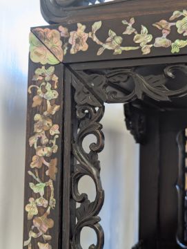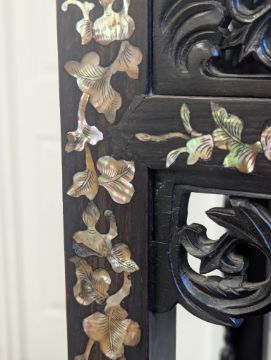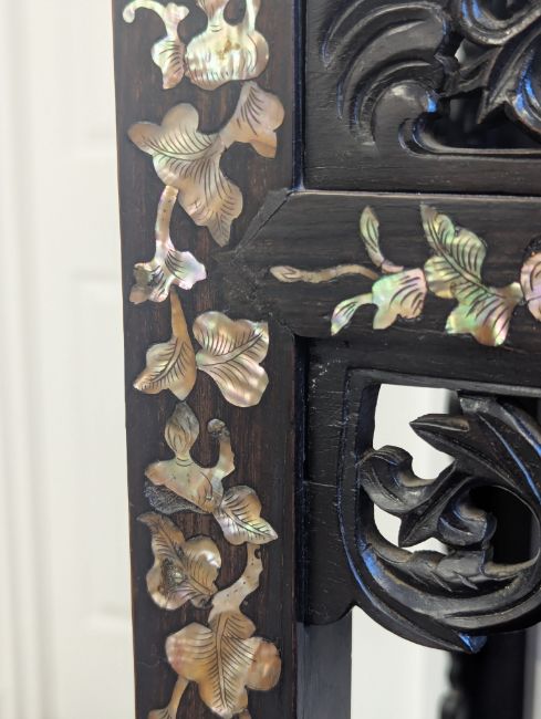 Condition: Six mother of pearl pieces missing to the corners. One minor loss to the hardwood finial. No structural problems.