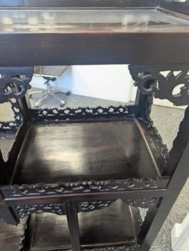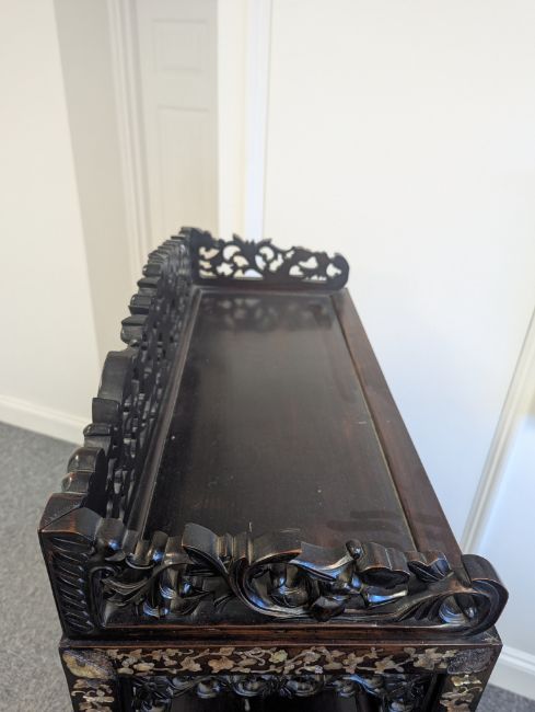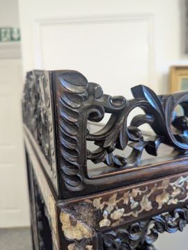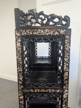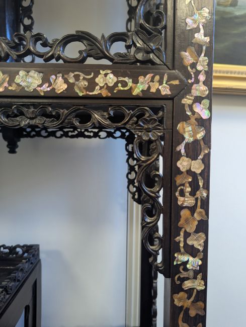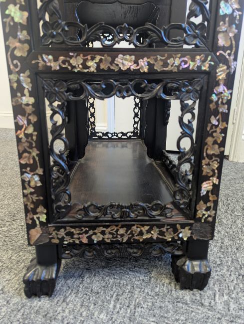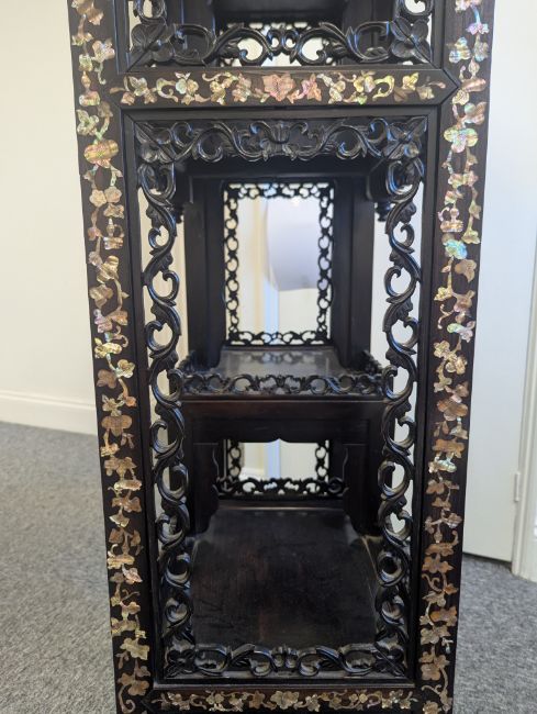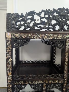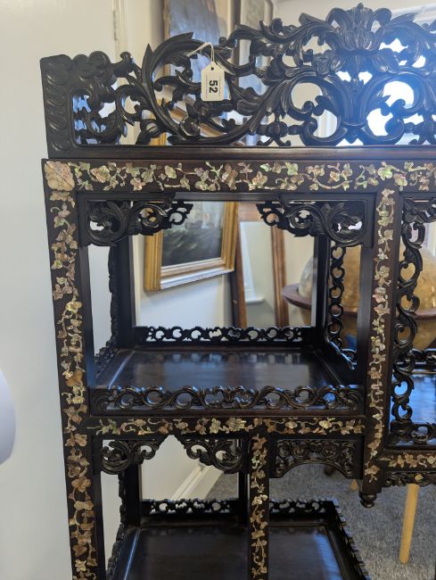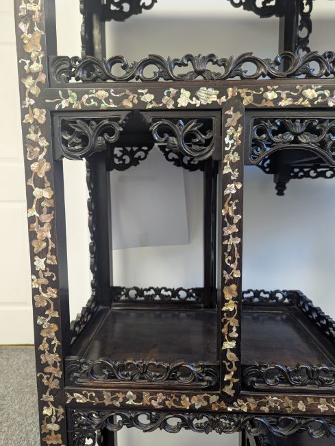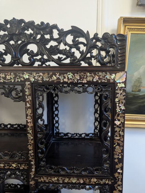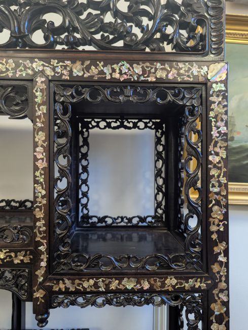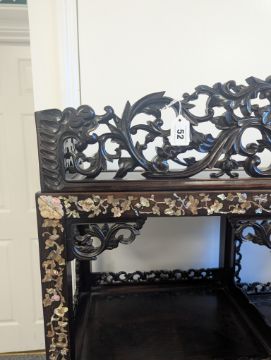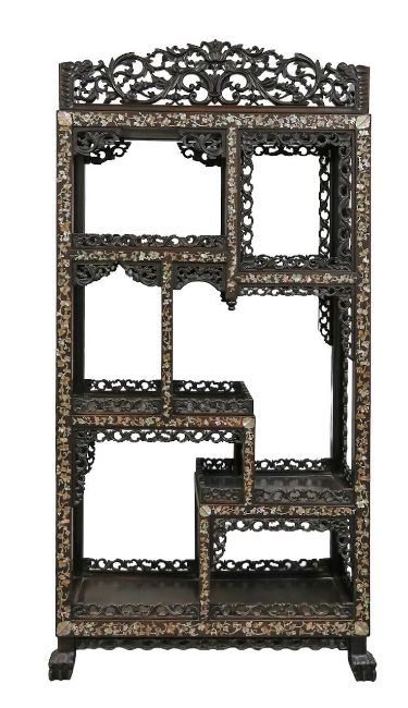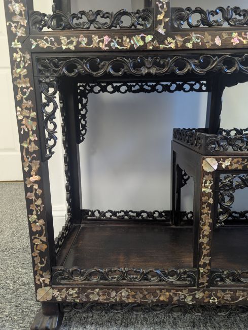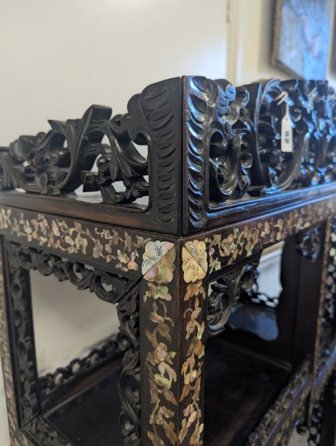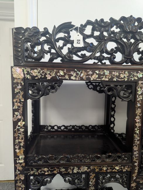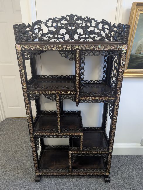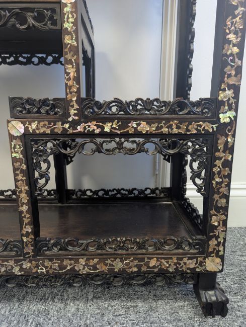 early 20th century, the pierced foliate pediment, above an arrangement of variously sized shelves, inlaid with mother of pearl foliate and floral decoration, raised on four claw and ball feet
