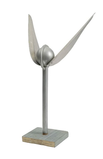 'Spirit of the Millennium', an abstract aluminium figure of a winged ball, raised on a painted wood base, signed 'John Skelton 1995'. This is the maquette for a full size work for the Civil Service Motoring Association, located on Station Street, Brighton.