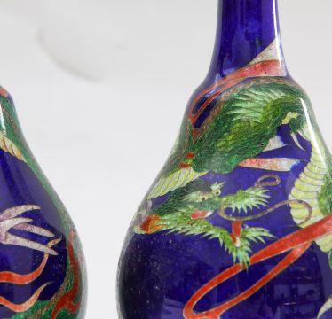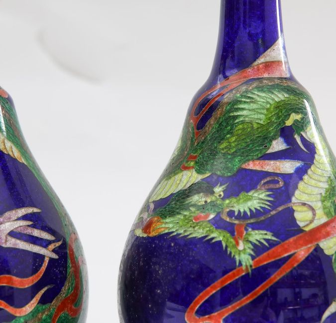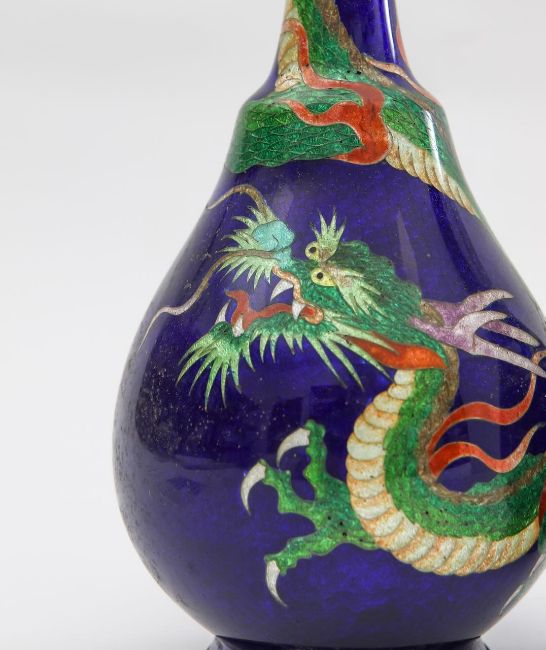 Meiji period (1868-1912), the flared rim leading to a slender neck, and bulbous body, decorated with a three clawed dragon, to a cobalt blue ground (2)