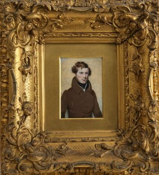 A portrait miniature on ivory of a young gentlemanmid-19th century, half-length, depicted with wavy brown hair, wearing a high collar coat, rectangular gilt mount, gilt and gesso frameDimensions: 9 x 6.5cm, framed 26 x 23.5cmCondition: general minor wear and loss to frameIMPORTANT NOTEThis item has been registered as exempt from the UK Ivory Act 2018. Ivory declaration submission number reference: WHS9L97F