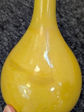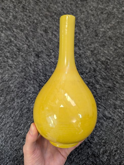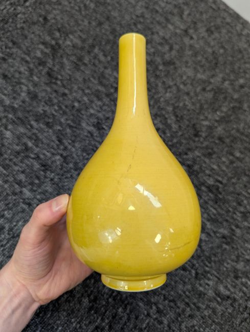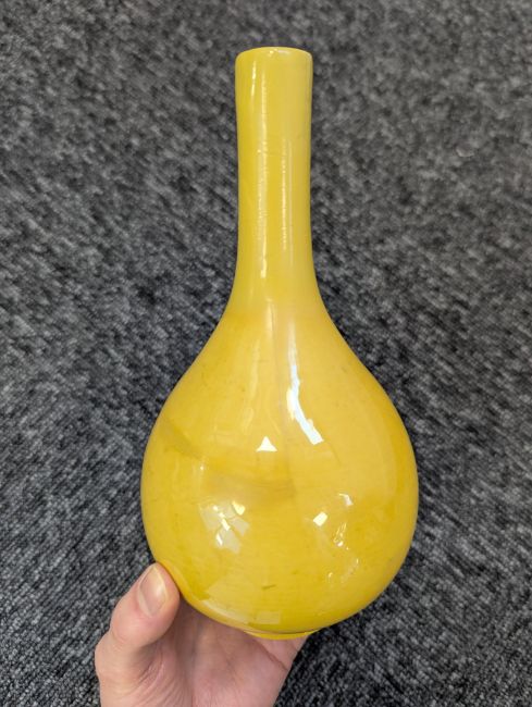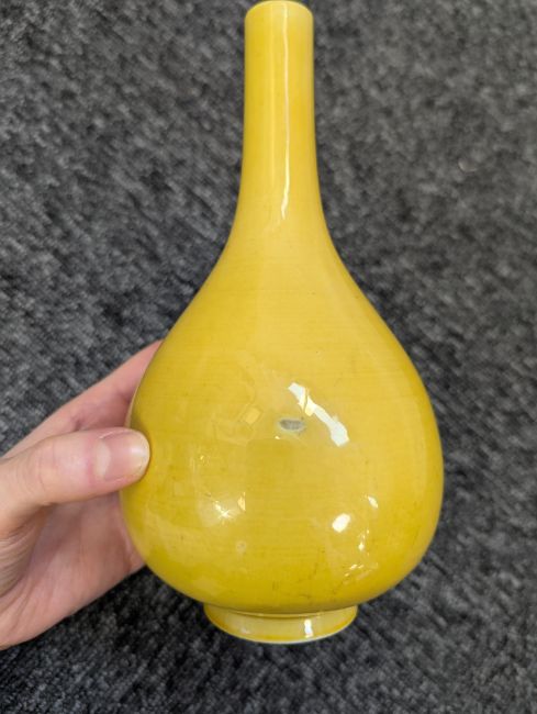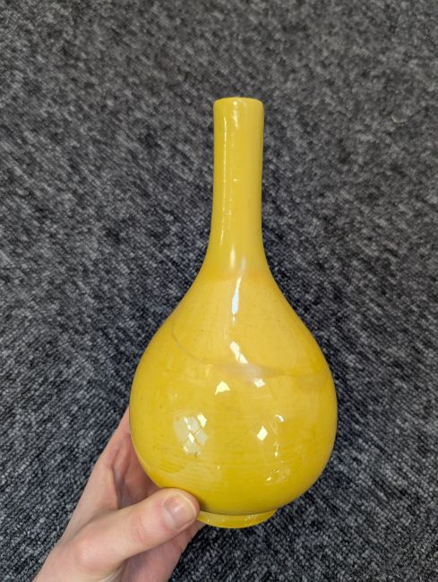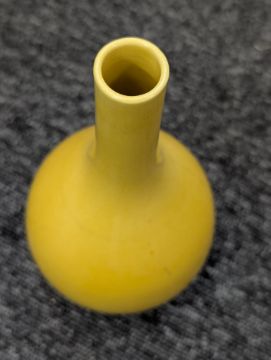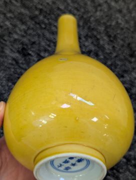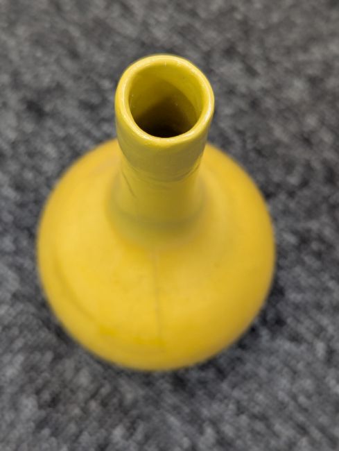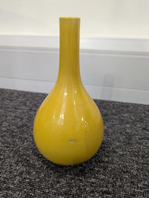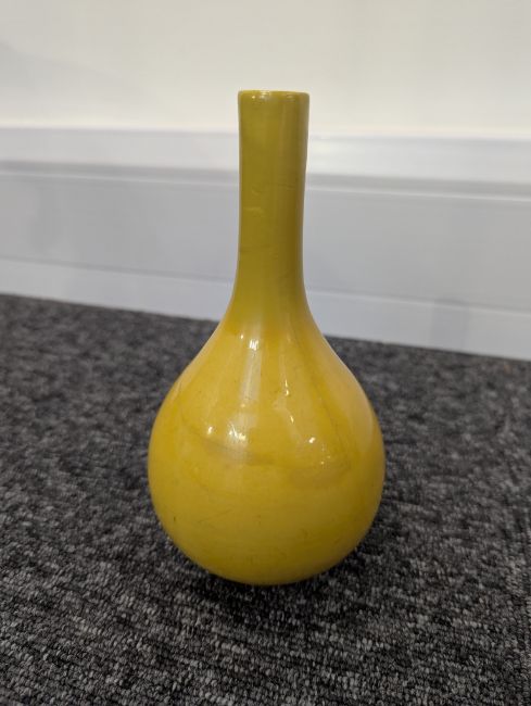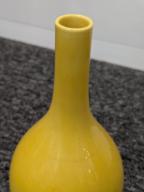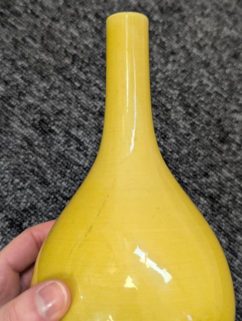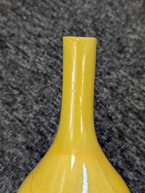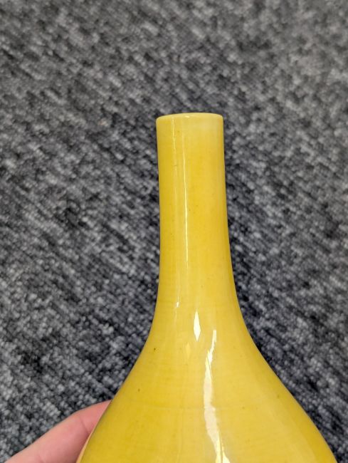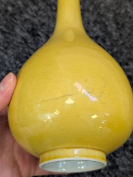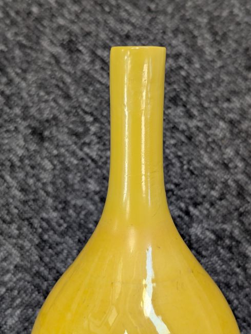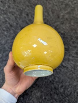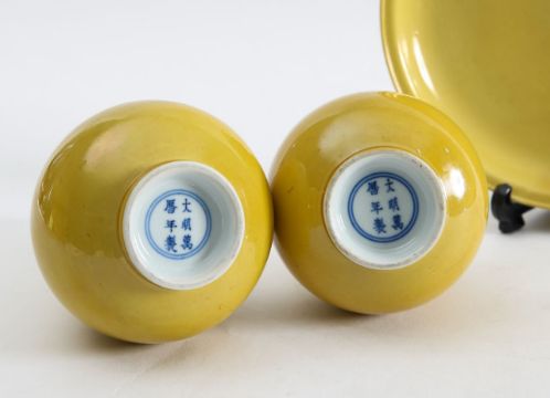 A pair of Chinese monochrome yellow glazed vases, and a dish on stand19th century, the bottle vases with a six character Wanli mark in a double circle to the bases, the shallow dish on a stand, unmarked (3) Dimensions: the vase height 20cm, the dish diameter 20.5cm Condition: The dish is heavily damaged with two restored breaks along the middle and a related piece stuck to the rim. One bottle vase cracked and restored, the other with marks, light scratches and a firing flaw. The dish is now in two peices and requires restoration.