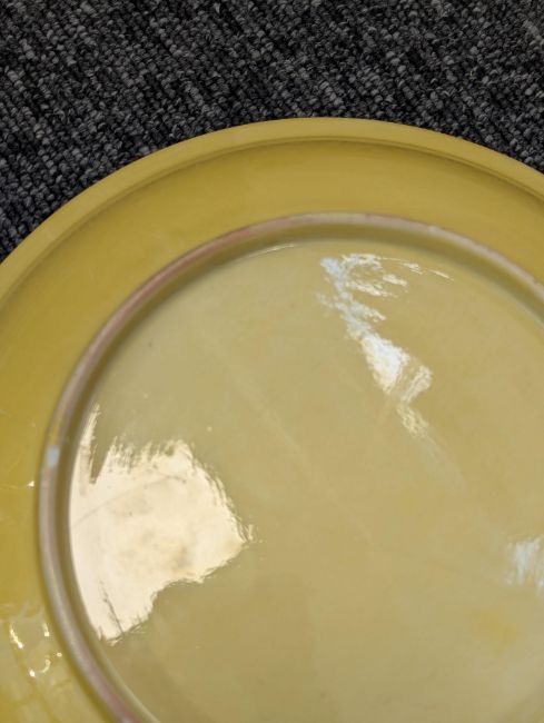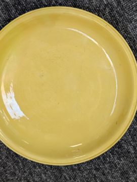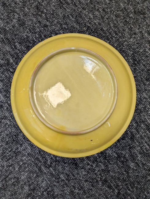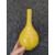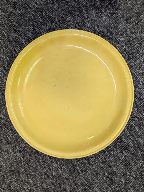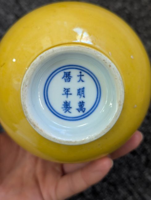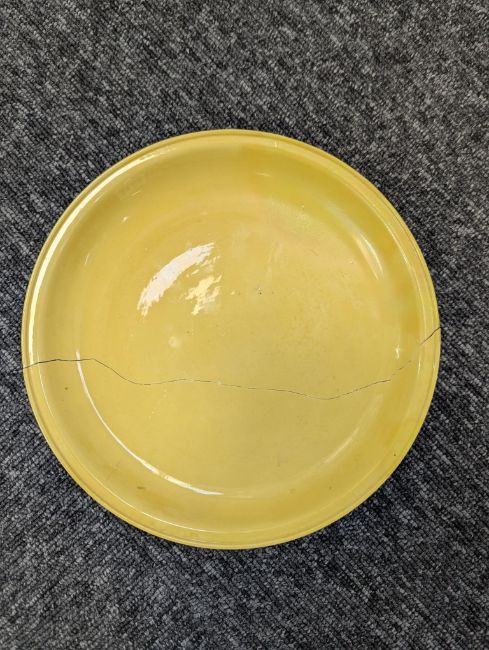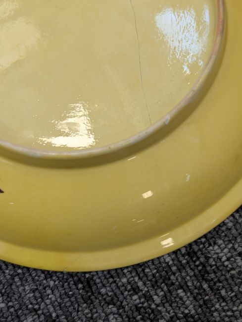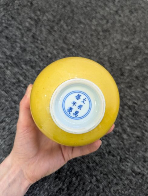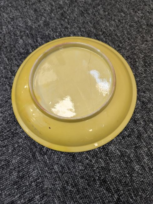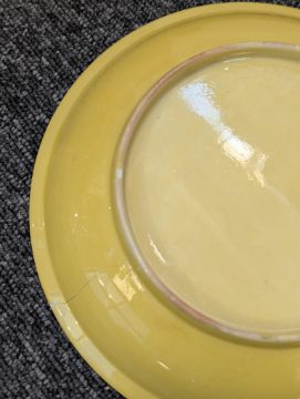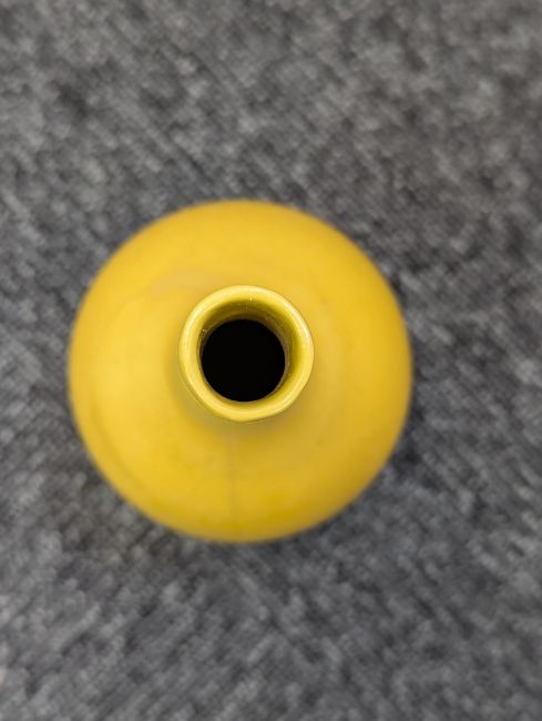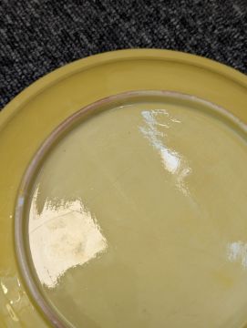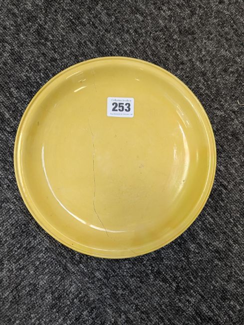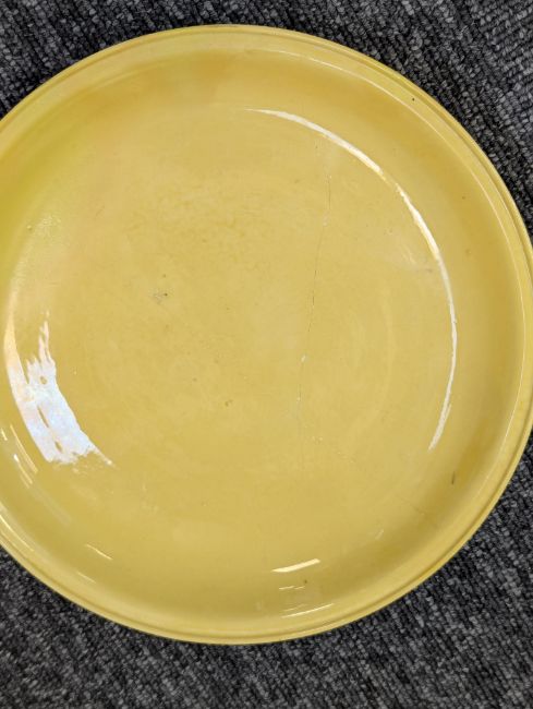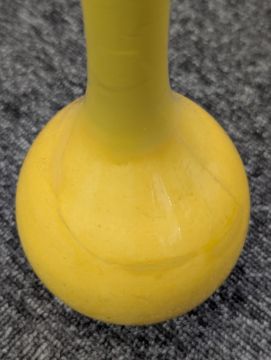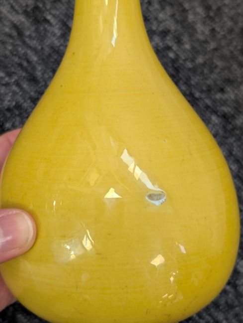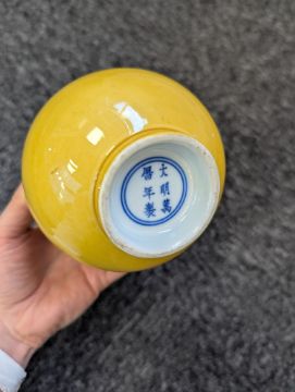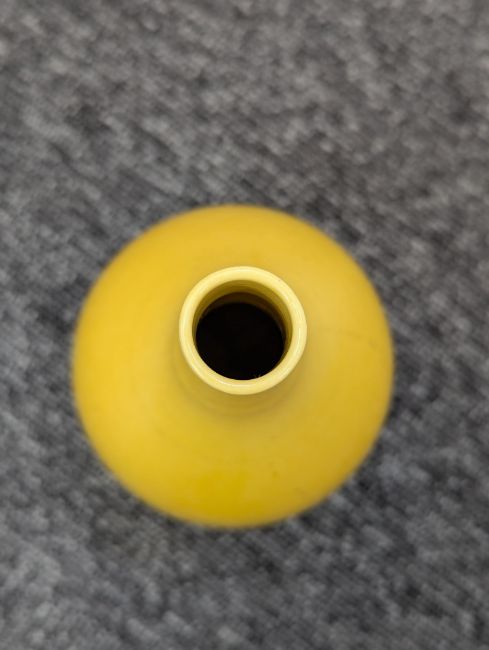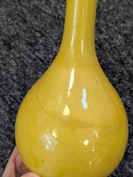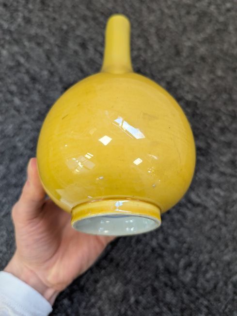A pair of Chinese monochrome yellow glazed vases, and a dish on stand19th century, the bottle vases with a six character Wanli mark in a double circle to the bases, the shallow dish on a stand, unmarked (3) Dimensions: the vase height 20cm, the dish diameter 20.5cm Condition: The dish is heavily damaged with two restored breaks along the middle and a related piece stuck to the rim. One bottle vase cracked and restored, the other with marks, light scratches and a firing flaw. The dish is now in two peices and requires restoration.