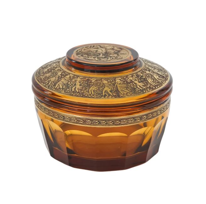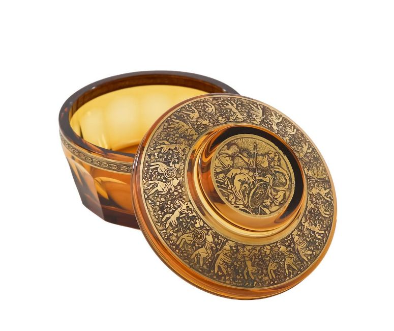 early 20th century, the centre of the cover etched and gilt with a figure of Athena, within a border of Greeks fighting Amazon warriors, to a facet cut glass bowl
