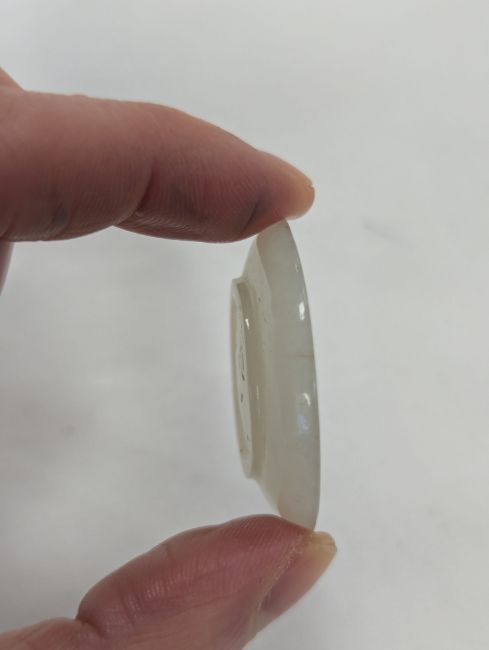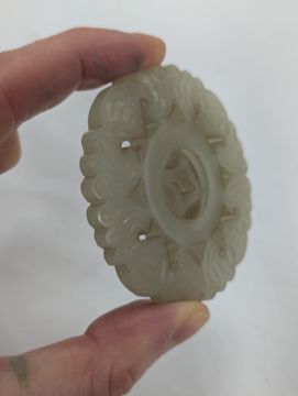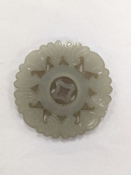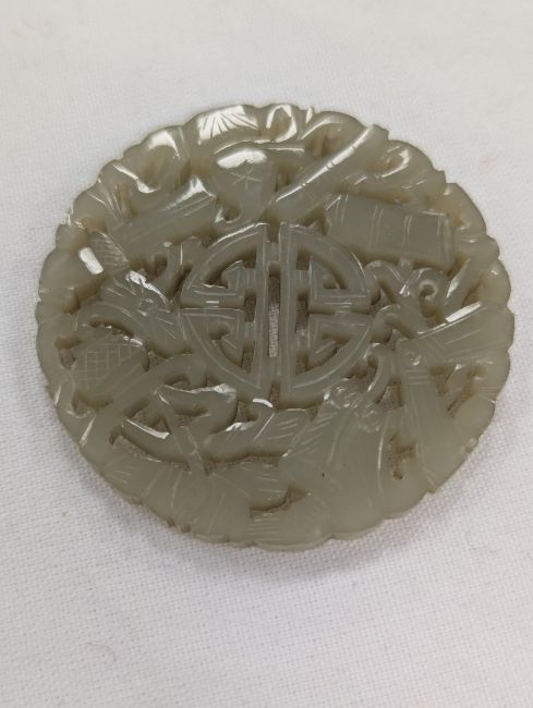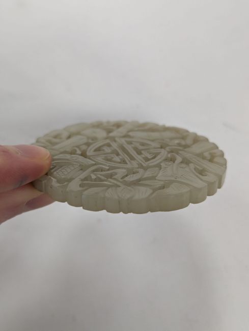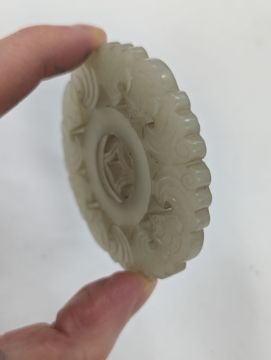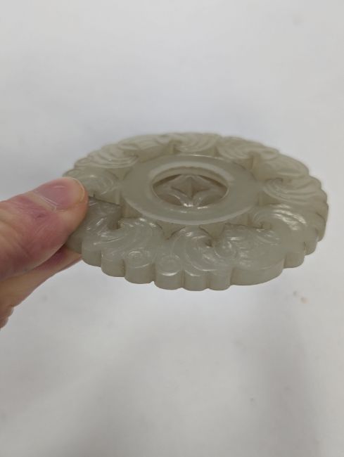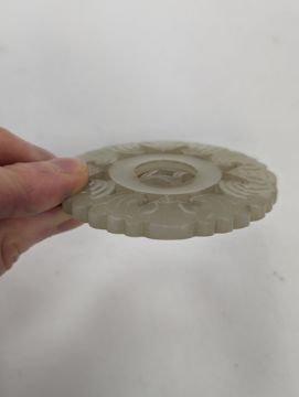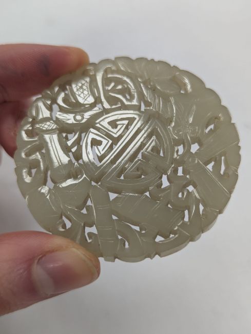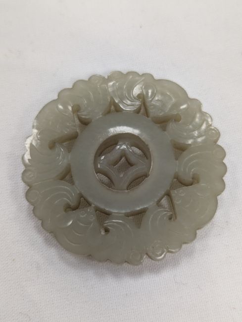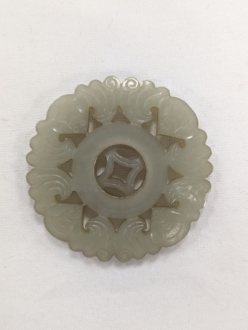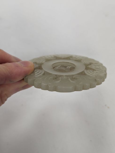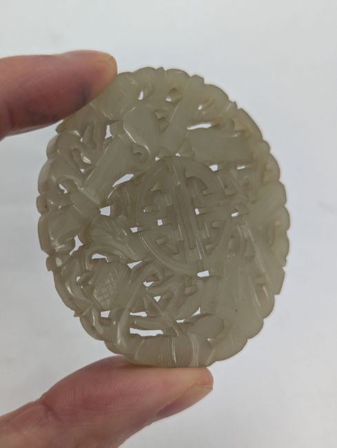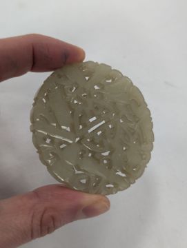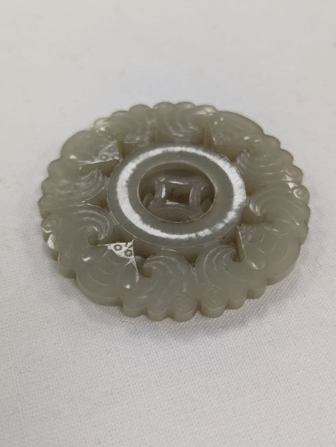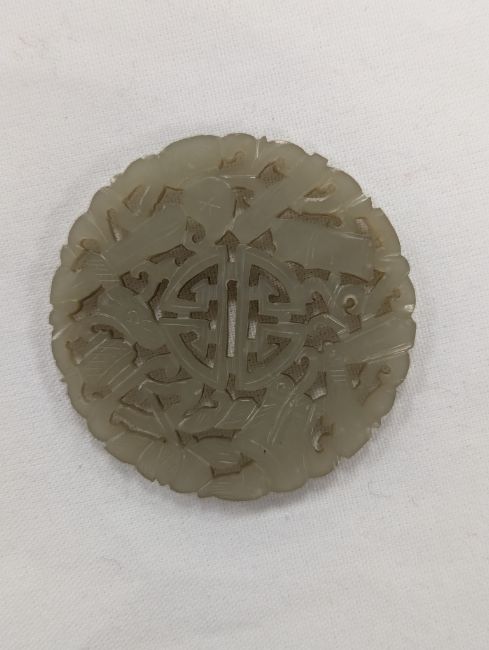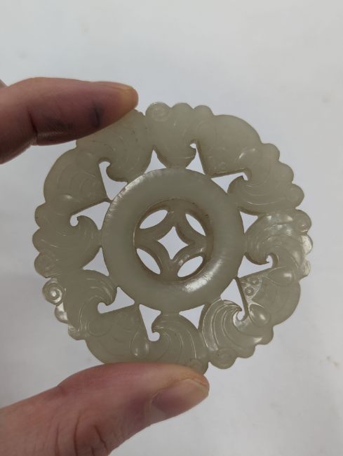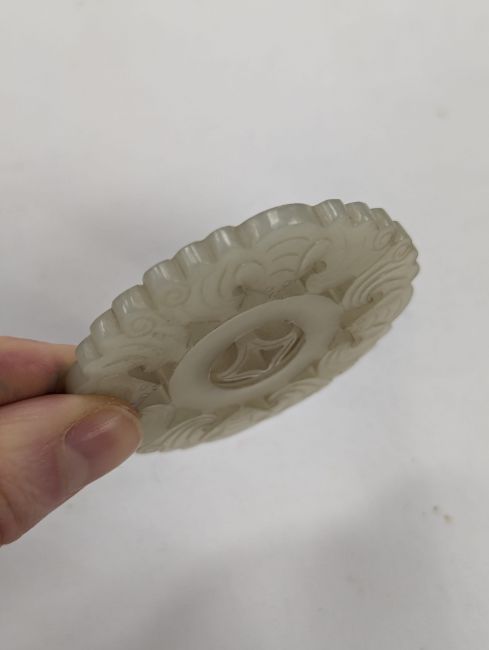 20th century, both with pierced decoration, including a rotating disc and an example with a Lu character mark, all on hardwood stands (3)
