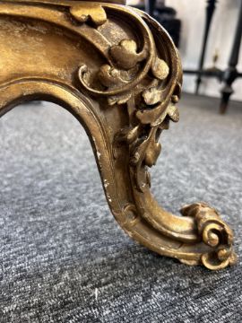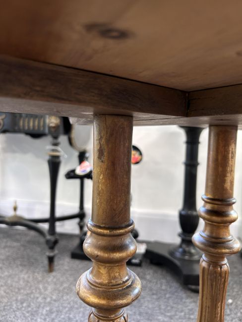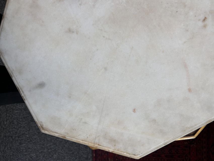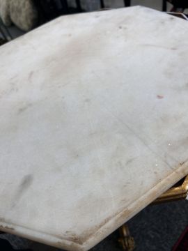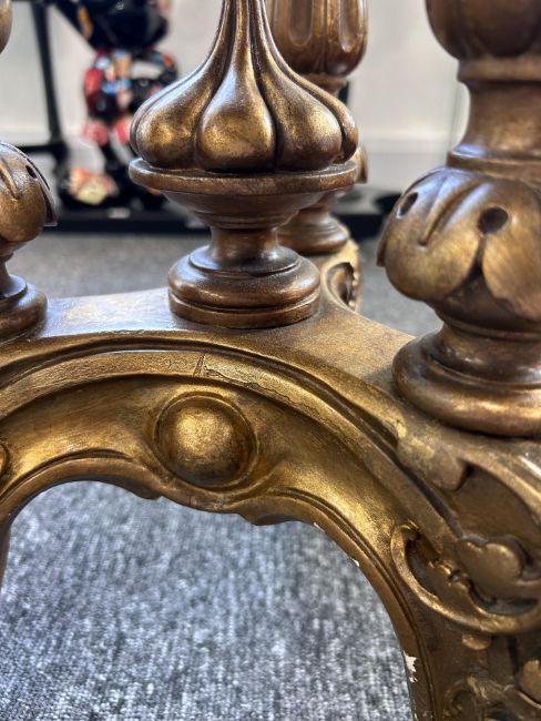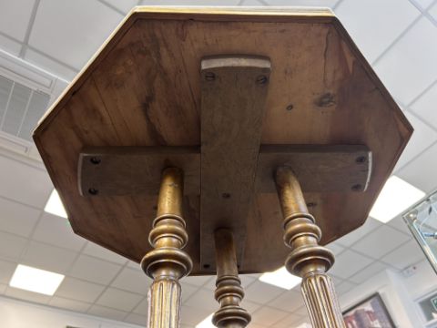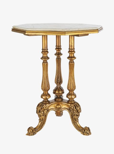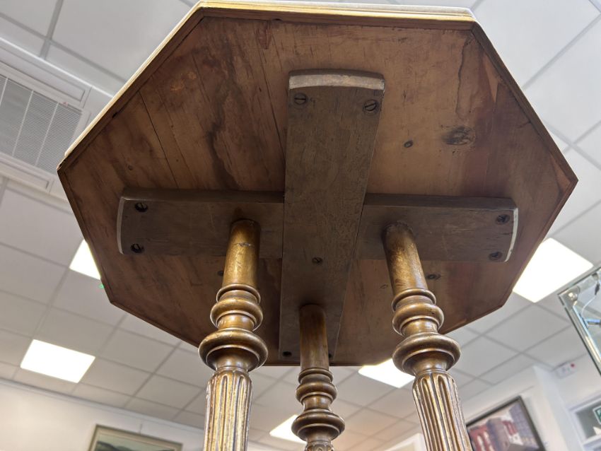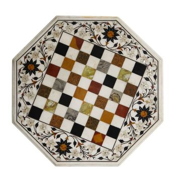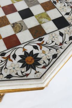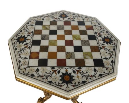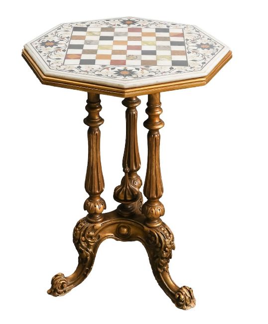 late 19th to early 20th century, the top of octagonal form, inlaid with a coloured hard stone chessboard, to a white marble border, inset with mother of pearl flowers, raised on a giltwood stand, with three fluted and knopped columns, leading to a triform base, raised on acanthus carved supports