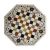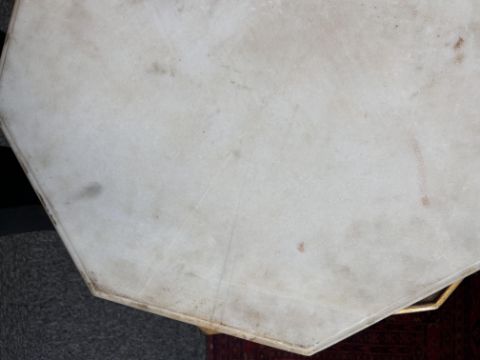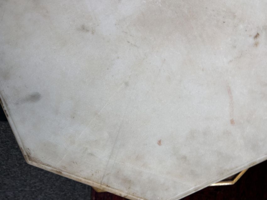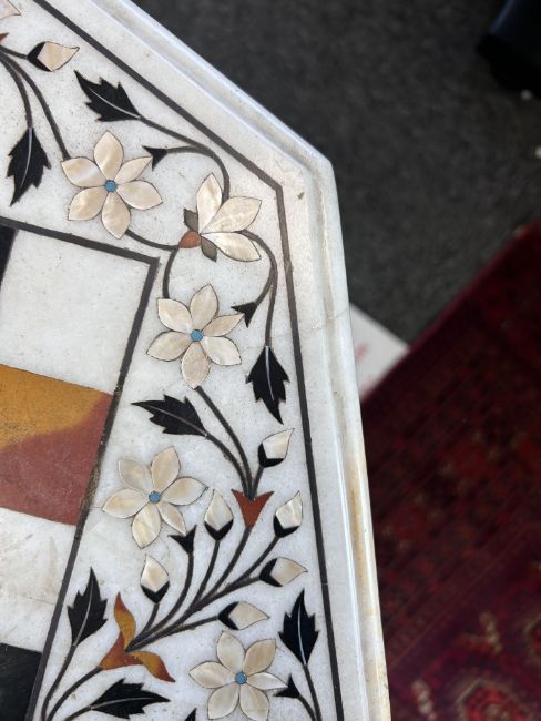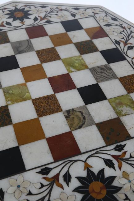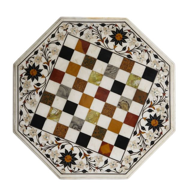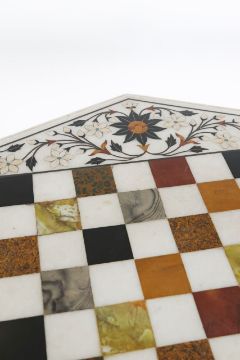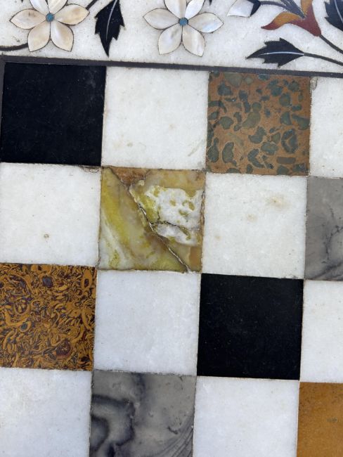 Condition: Losses and repairs to the mother of pearl. No chips to the marble, but natural cracks to the chessboard. The stand is intact.