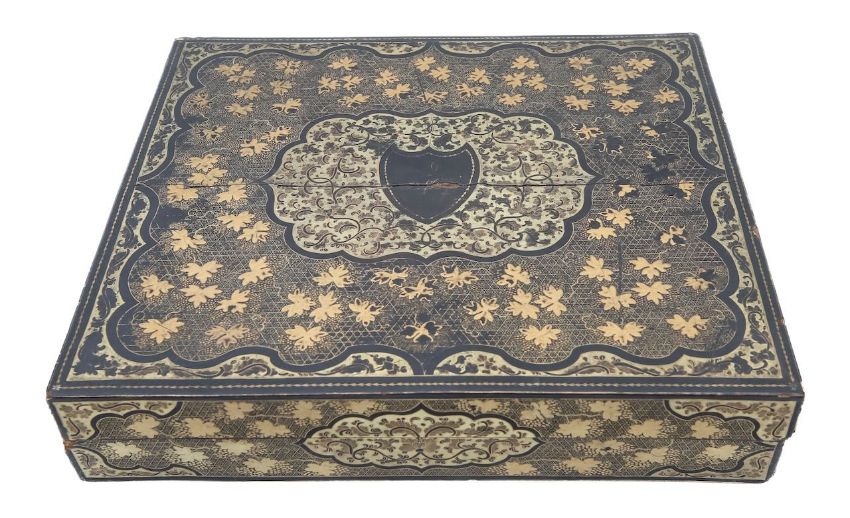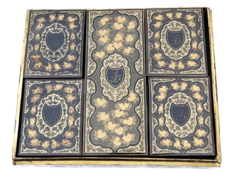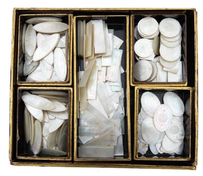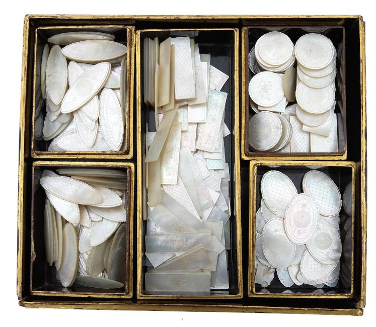 Qing Dynasty, circa 1800-1830, the lacquer box, with shield shaped cartouche to lid and with typical gilt decoration, opening up to reveal compartmented interior of five lidded compartments containing various sizes of mother-of-pearl gaming counters all carved in low relief on one side with family monogram and floral borders, and trellis to the reverse