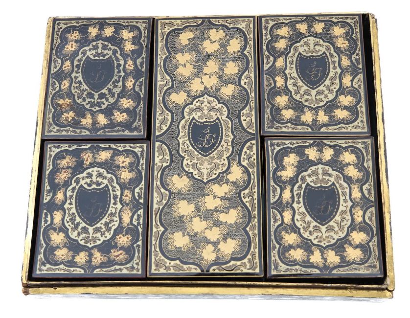 Condition: The box with split to lid. One of the edges a little worn and missing a small section 1cm. Many of the counters in good condition. The interior lids in good condition. The outer box lid and sides etc with wear commensurate with age