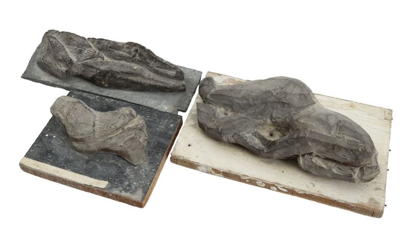 Three maquettes: 'Aftermath of War', clay, attached to slate slab base; Gluteus Maximus', clay, attached to wooden base, labelled underneath; 'Innominata', 1976, clay, attached to wooden base (3)