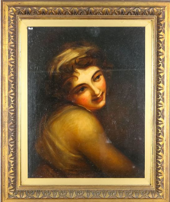 a portrait of a lady, possibly Emma Hamilton, oil on canvas, backed on board, within a gilt frame