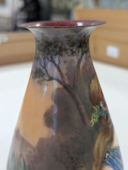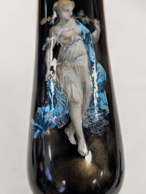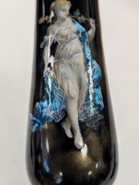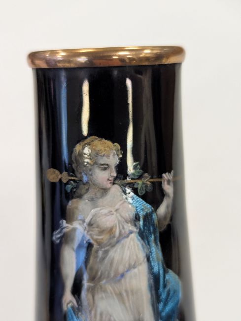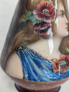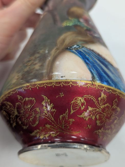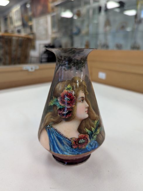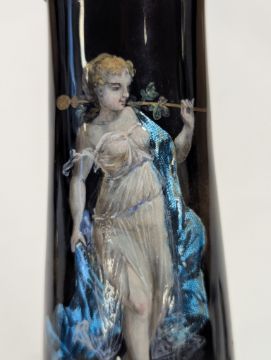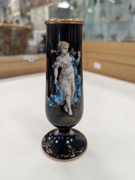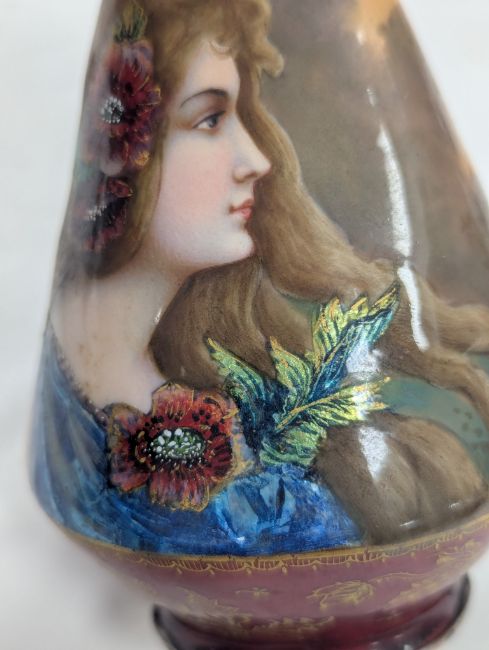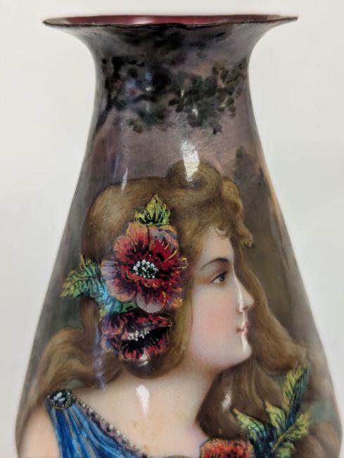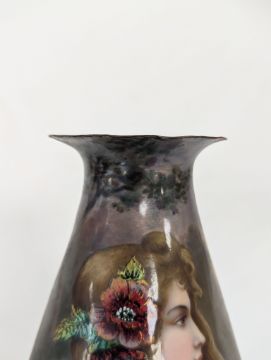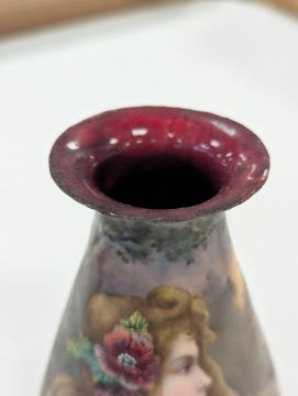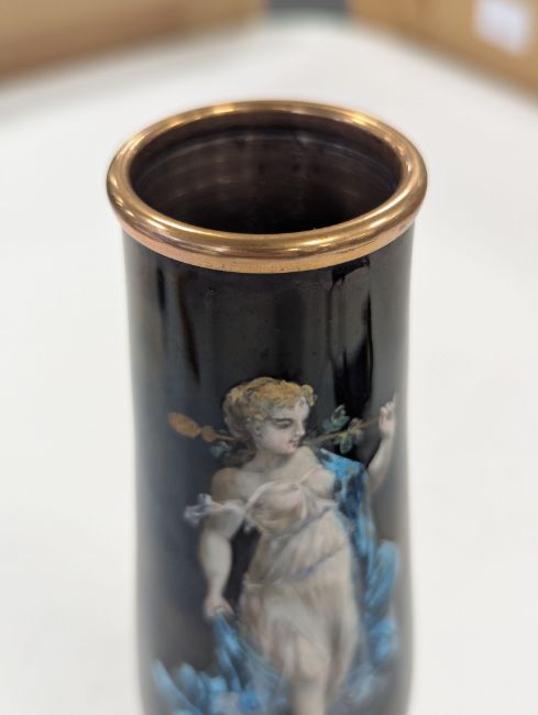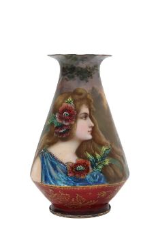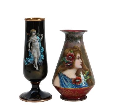 Two French hand-painted enamel vaseslate 19th century, the first depicting an Art Nouveau maiden, her flowing brunette hair with poppies, within a wooded landscape, raised on a silver base stamped "Sterling, Weighted', decorated in crimson red enamel, with floral gilding, the second a tapered lacquered enamel spill vase, by Gobleutz, depicting a neo-classical maiden carrying a blue cloak and wearing a white dress (2)Dimensions: height of the former 14cmCondition: Silver based example) The rim is chipped and uneven. Fine cracks around the base. Signs of possible over-painting.Copper based example) Rattles. Wear to the gilding.