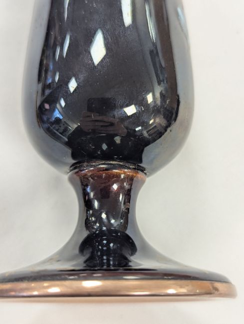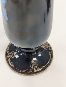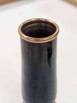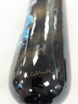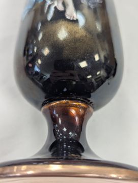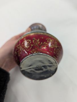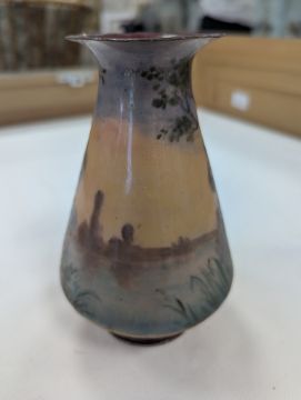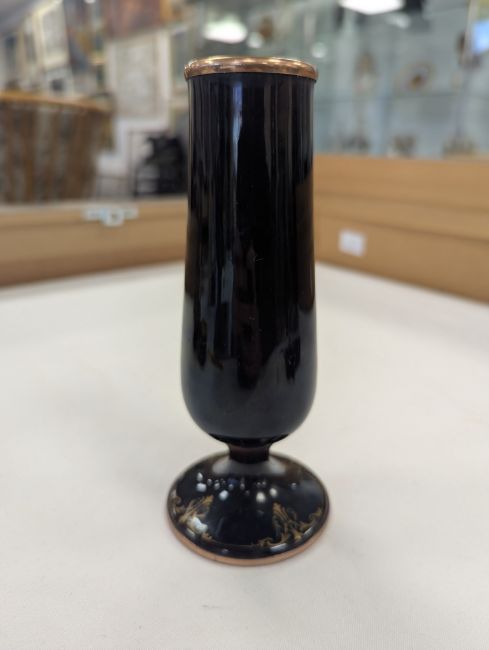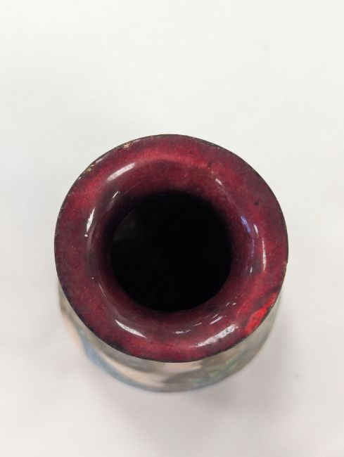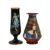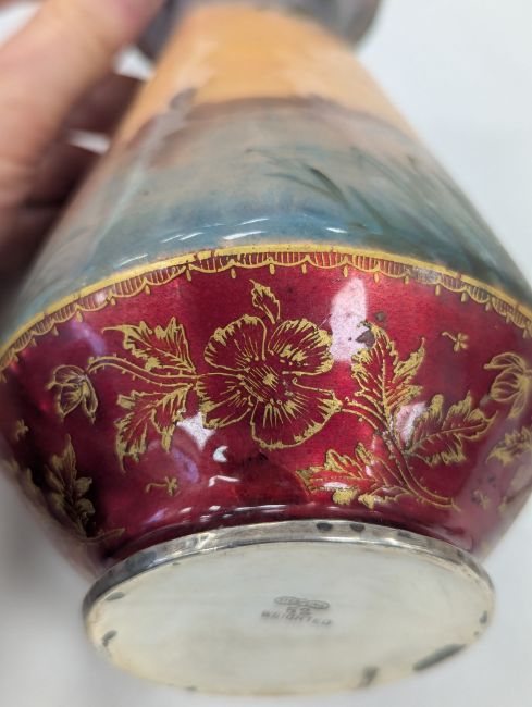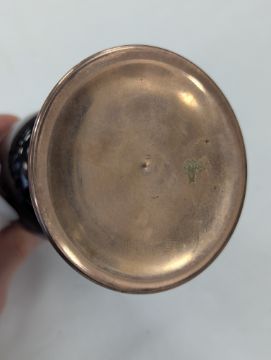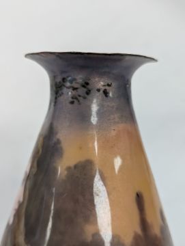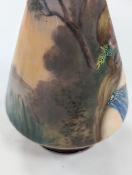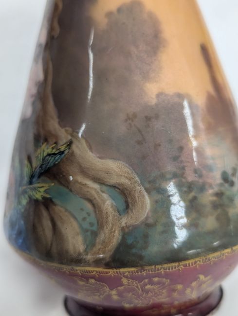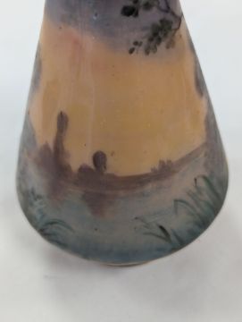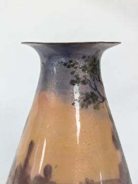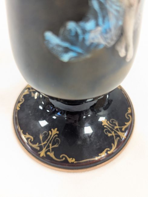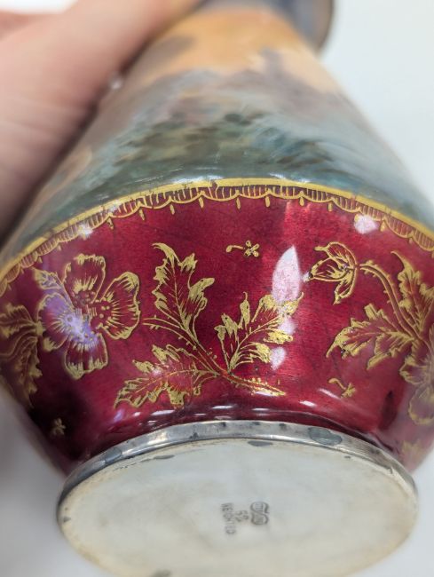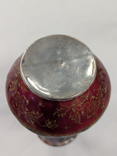 Two French hand-painted enamel vaseslate 19th century, the first depicting an Art Nouveau maiden, her flowing brunette hair with poppies, within a wooded landscape, raised on a silver base stamped "Sterling, Weighted', decorated in crimson red enamel, with floral gilding, the second a tapered lacquered enamel spill vase, by Gobleutz, depicting a neo-classical maiden carrying a blue cloak and wearing a white dress (2)Dimensions: height of the former 14cmCondition: Silver based example) The rim is chipped and uneven. Fine cracks around the base. Signs of possible over-painting.Copper based example) Rattles. Wear to the gilding.