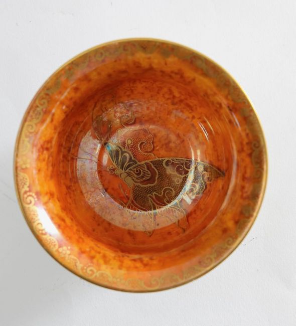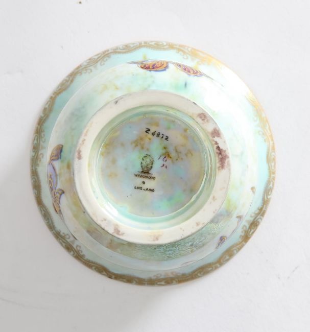 decorated with gilt butterflies against a pale green ground, with a mottled orange lustre to the interior, pattern number Z4872, gilt marks to base