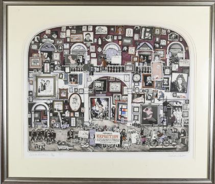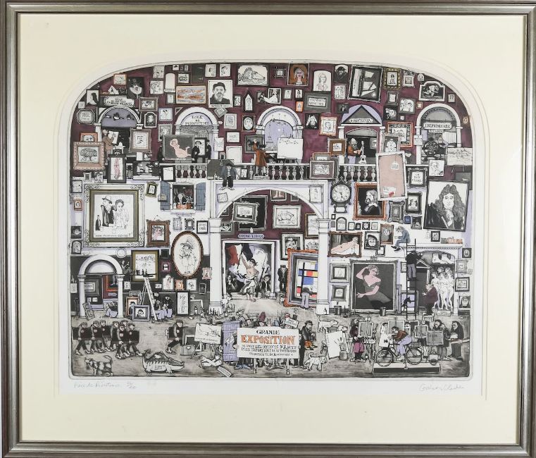 'Piece De Resistance', aquatint with hand colouring, depicting the 'Grande Exposition', a gallery featuring famous French works of art and figures, signed in pencil, limited edition, 22/400