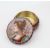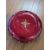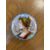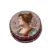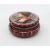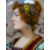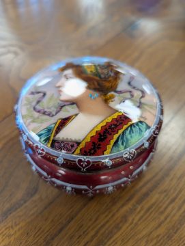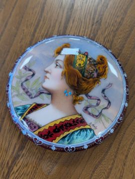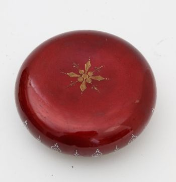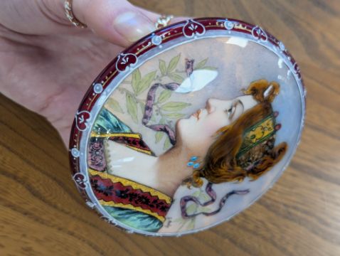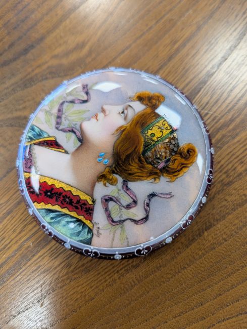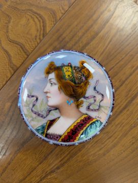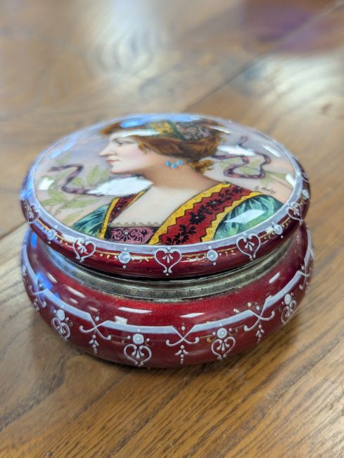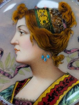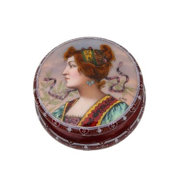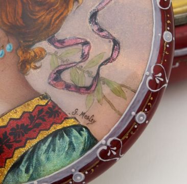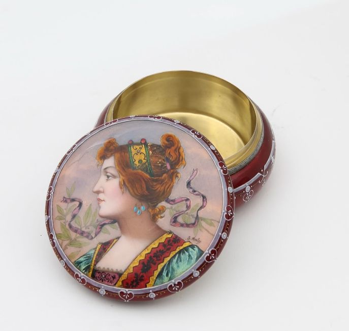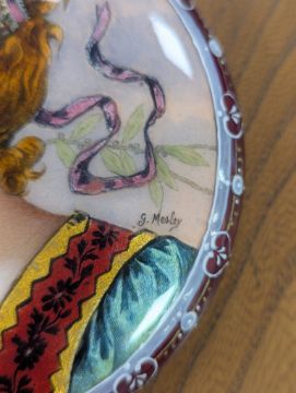 early 20th century, possibly Limoges, of circular form, depicting a woman with red hair, tied with a flowing pink ribbon, signed 'G. Mesley', to a deep red enamel ground, with scroll patterns to the sides
