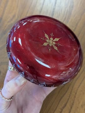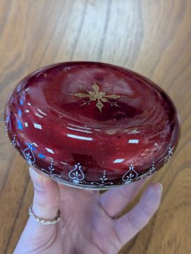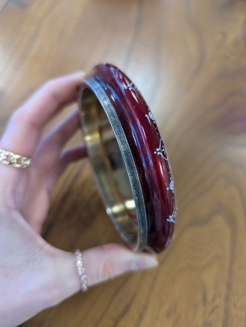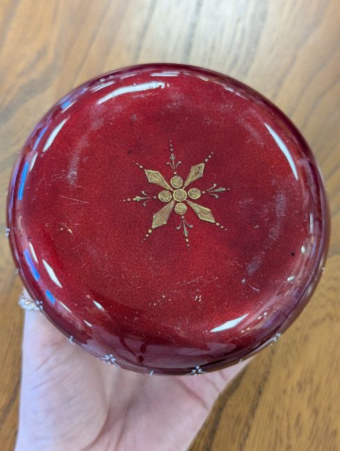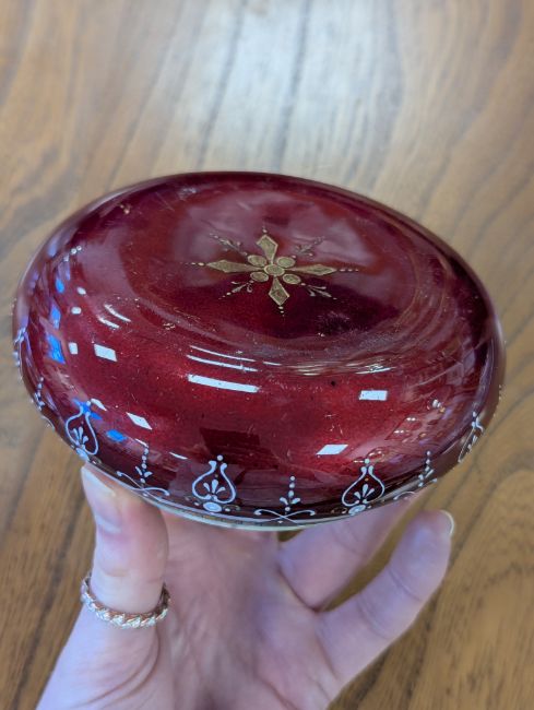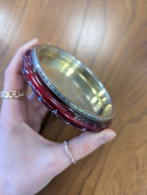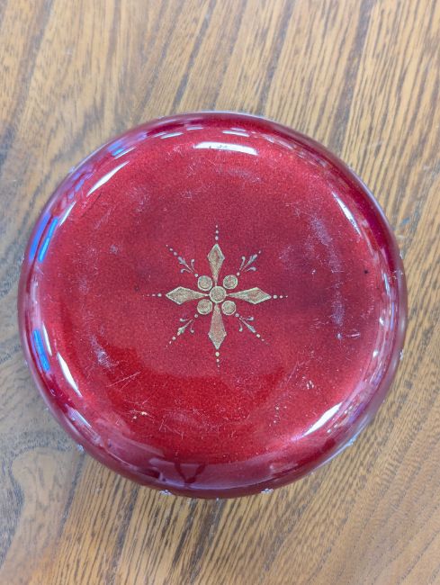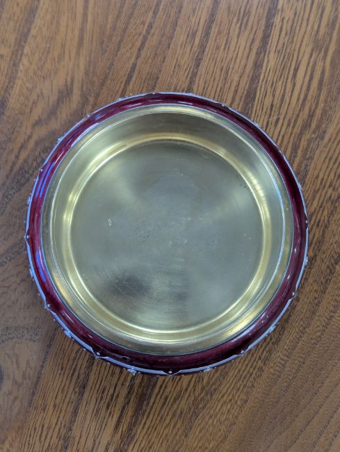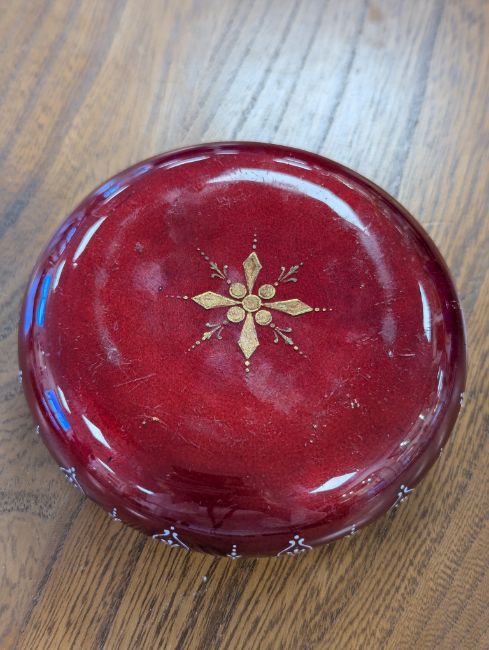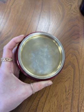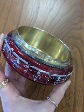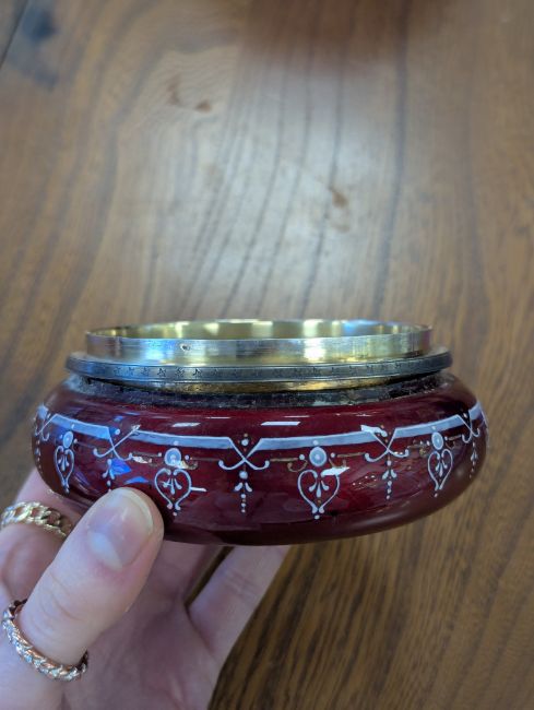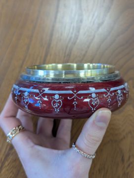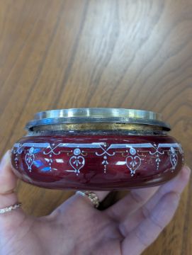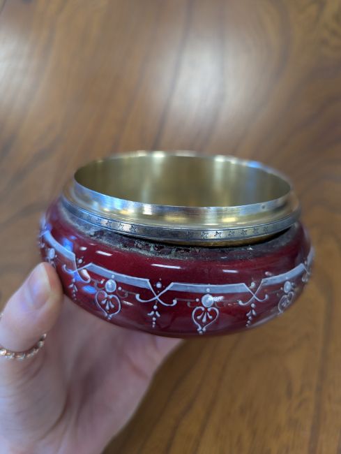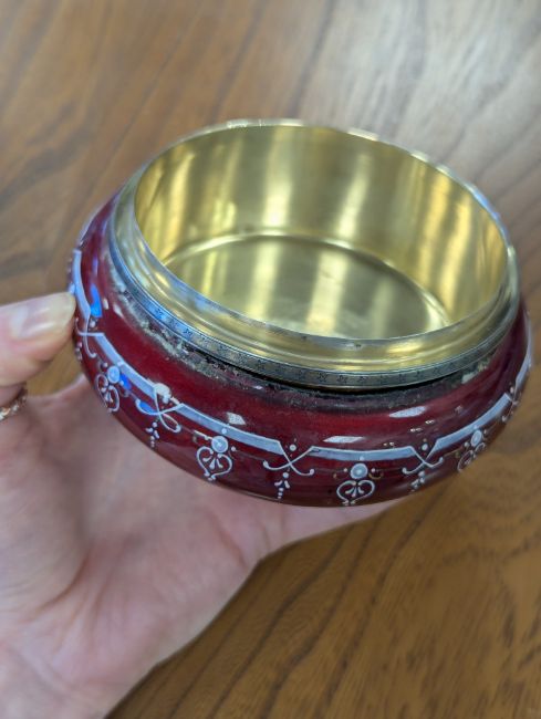Condition: The silver rim and interior liner is coming away from the enamel. Scratches to the cover.