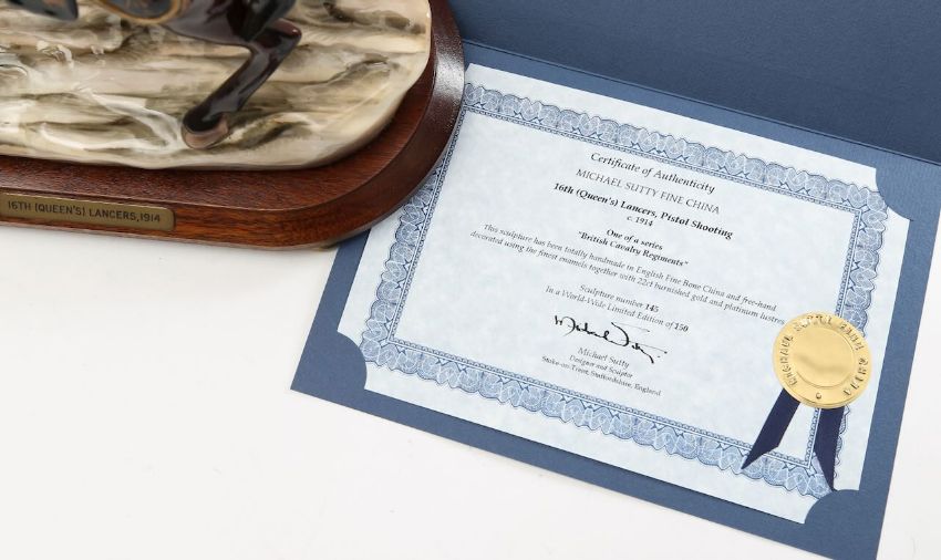 of a 16th (Queen's) Lancer, Pistol Shooting, c.1914, from the British Cavalry Regiments series, signed, limited edition no. 145/150, raised on a wood base, with its original certificate of authenticity