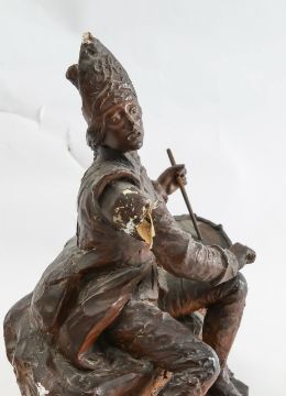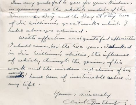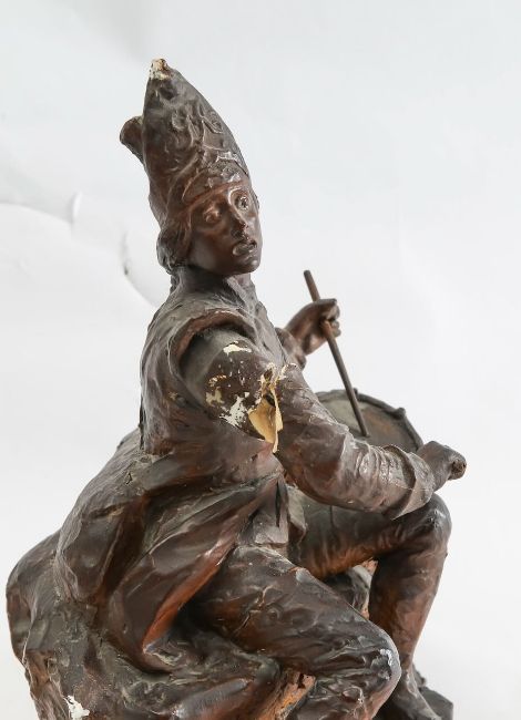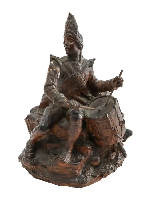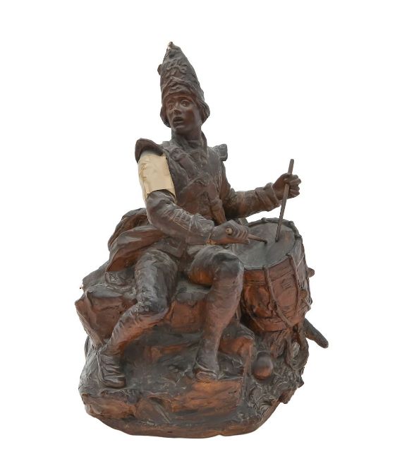 'Little Drummer Boy', a painted plaster maquette, modelled seated on an integral naturalistic base; together with a copy of a letter from Cecil Gunthorp to Goscombe-John thanking him for the gift