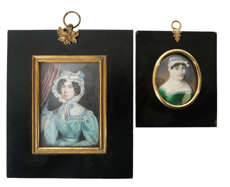 19th century, the first facing right wearing a lacy bonnet and collar to dress, the second of 'Mrs Munday', 1828 (2)