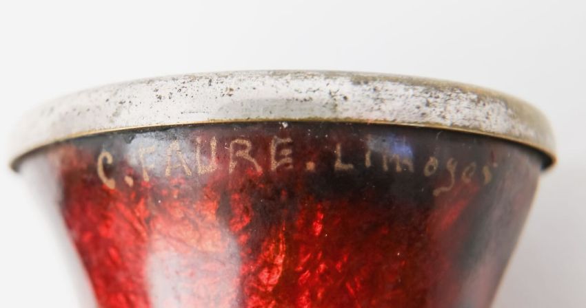early 20th century, in graduated red and pink textured enamel, with a white metal rim and base, signed in gilt to the rim signed around the rim 'C.Fauré Limoges'