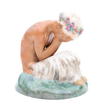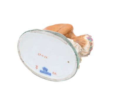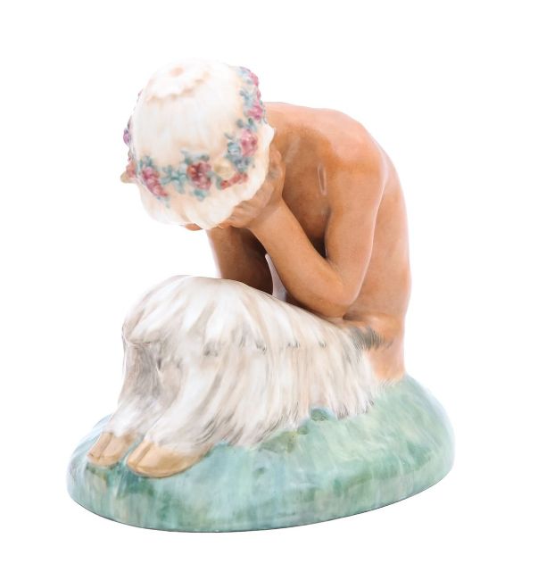 a porcelain figure of a 'Weeping' or 'Crying Faun', modelled crouched holding its head in its hands, wearing a flower crown, painted marks and signature to the base, dated '29-1-24', incised no. 1188 35