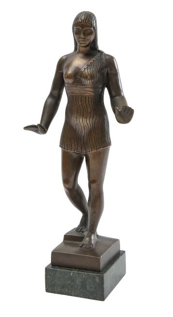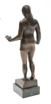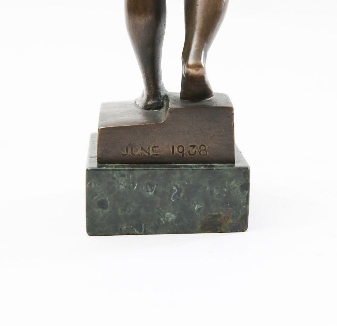 a bronze Arcaic style figure of a standing lady, wearing a bathing costume, with one breast exposed, raised on a marble base, signed and dated 'June 1938'