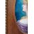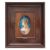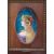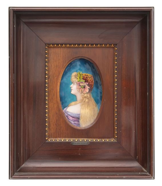 early 20th century, decorated with a pretty young maiden with long flowing blonde hair wearing an orange bonnet, with green leaf and orange flower, against a teal blue ground, signed and framed