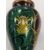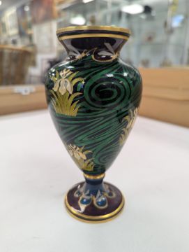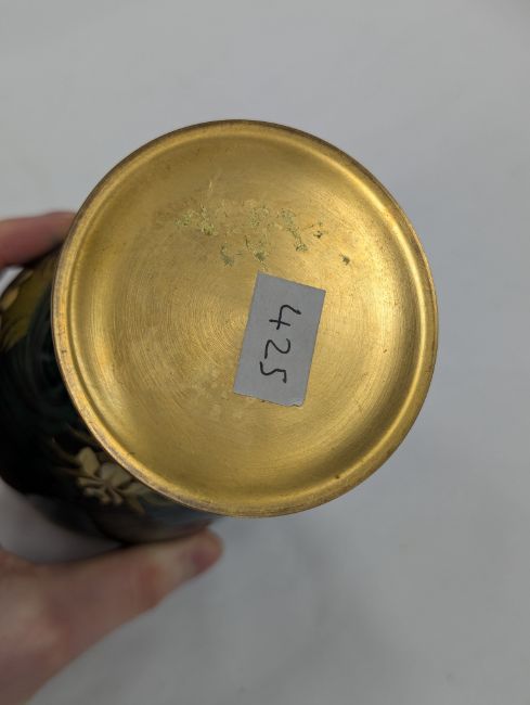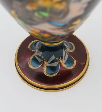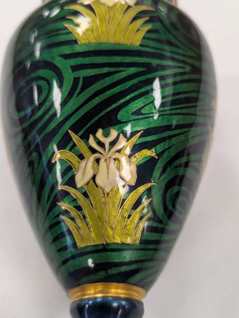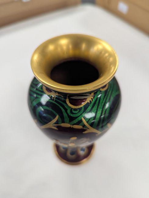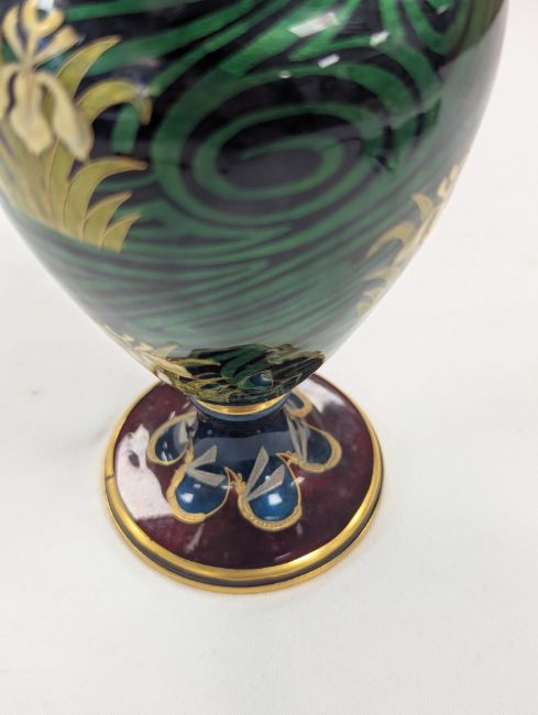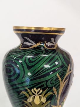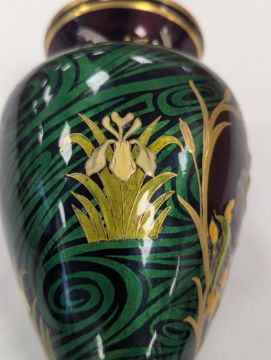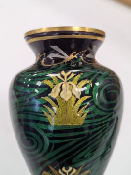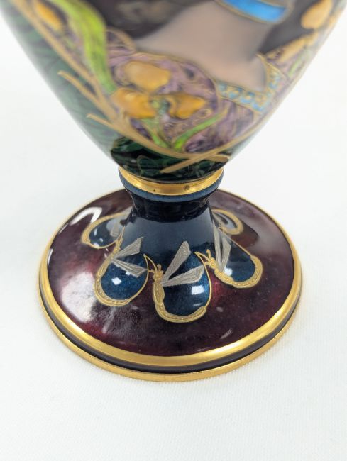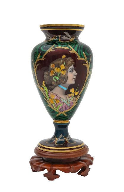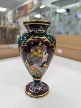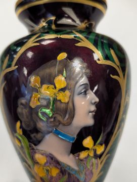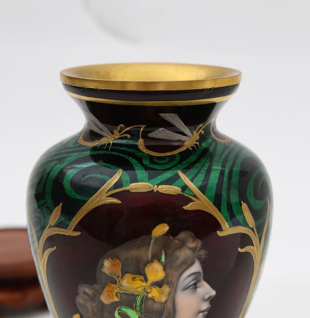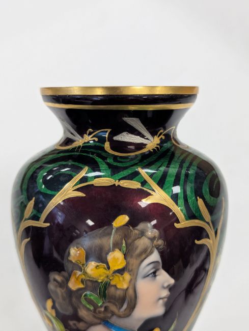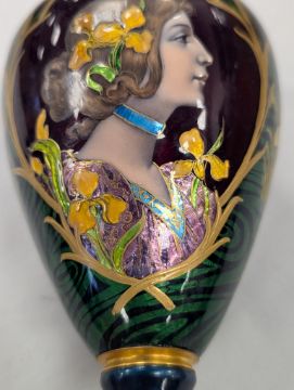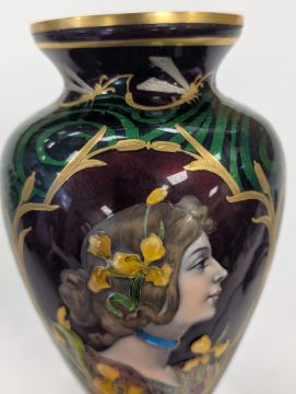 An Art Nouveau enamel vase,early 20th century, French, depicting a profile of a young woman, her hair tied back with yellow iris, within a gilt border, the body decorated with gilt dragonflies and flowers to a swirled green ground Dimensions: height 16.5cmCondition: Good, no chips, cracks or crazing. Minor wear to the gilding on the base.