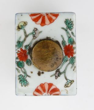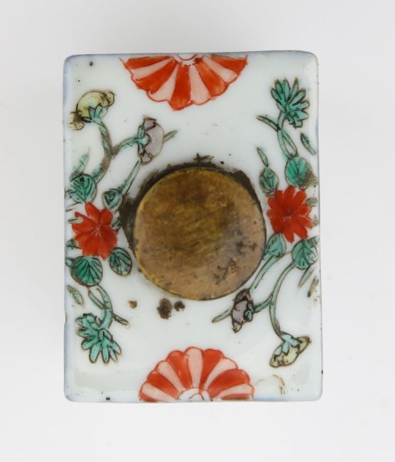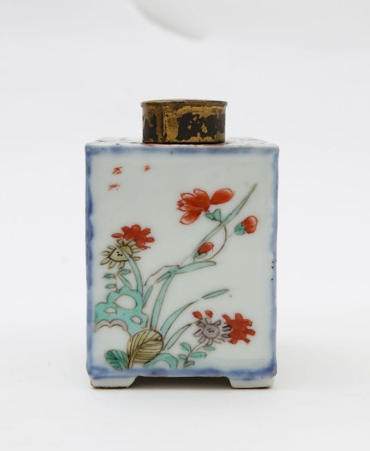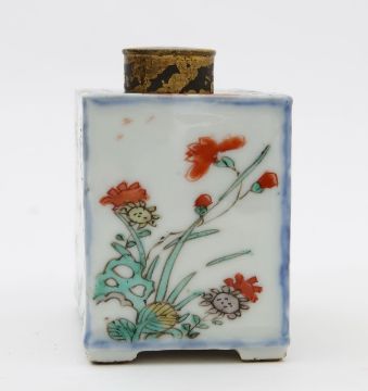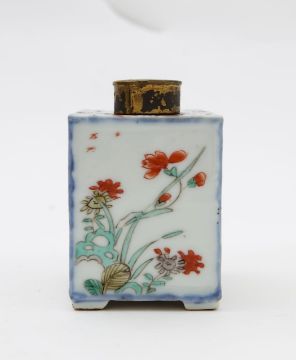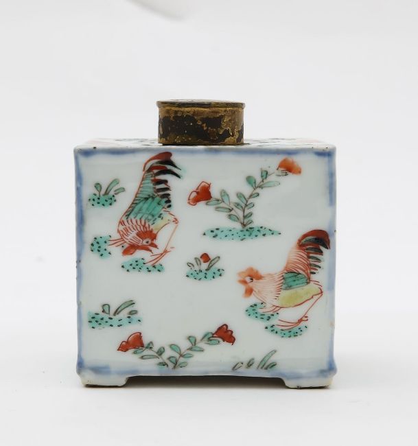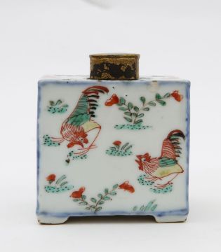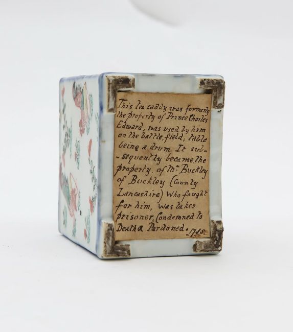 Kangxi period (1662-1722), of rectangular form, decorated with cockerels among flowers, the paper label to the base suggesting an important provenance, inscribed 'This tea caddy was formerly the property of Prince Charles Edward, was used by him on the battlefield, table being a drum. It subsequently became the property of Mr. Buckley of Buckley (Country Lancashire) who fought for him, was taken prisoner, condemned to death & pardoned, 17?5'