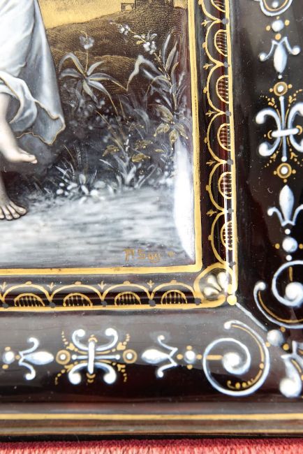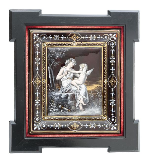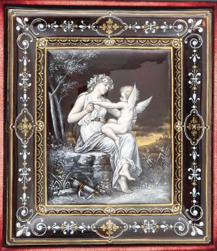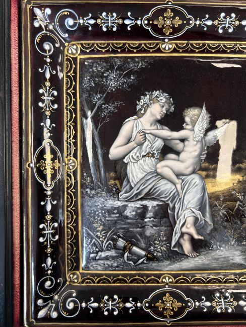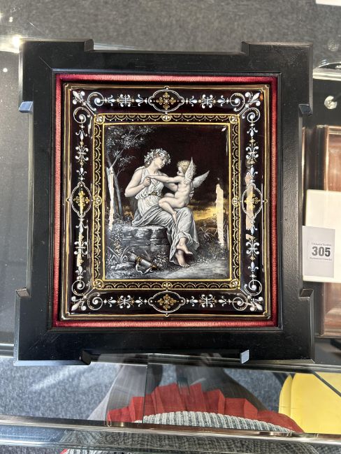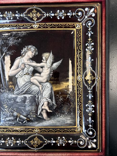 decorated with neo-classical scene of a seated maiden and a winged figure in a woodland on a grey/black ground with relief enamel border of scrolls and fleur de lis, signed, framed and mounted