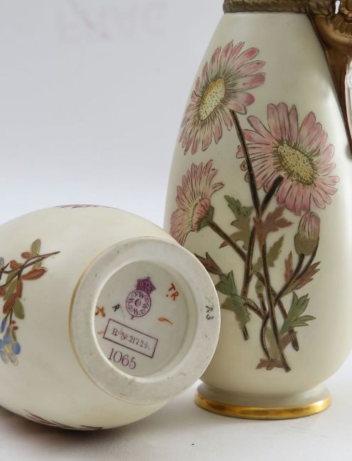decorated with flowers to an ivory ground, the jugs dated 1888 and 1891, shape no. 1094, the ewers dated 1888, shape no. 1065 (4)