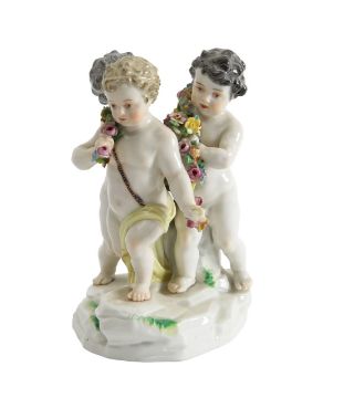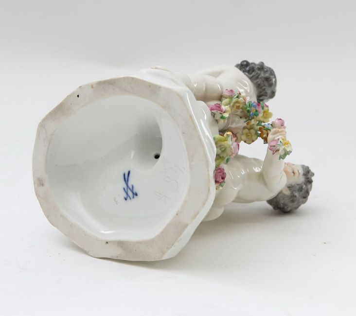 19th century, originally designed by Friedrich Elias Meyer, depicting putti boys, holding encrusted floral garlands, under glazed blue crossed swords mark, impressed model no. A84