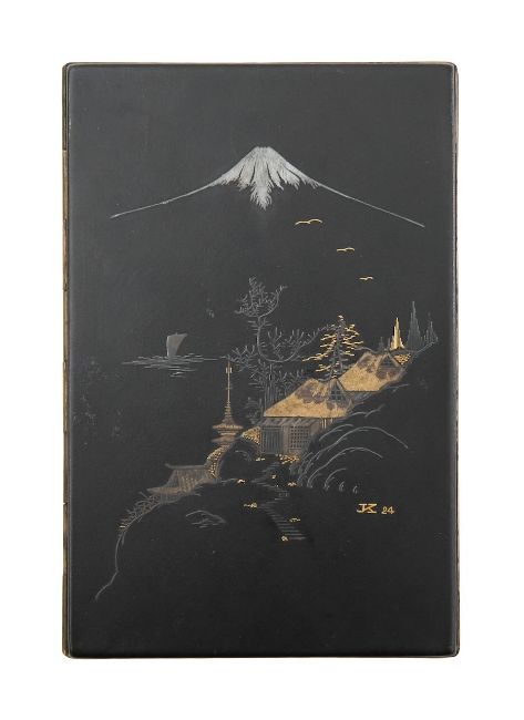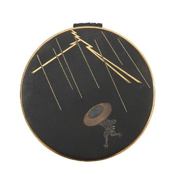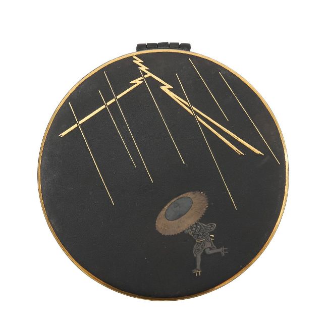 c.1920s, the compact decorated with a lady holding an umbrella, running in a thunderstorm, the cigarette case, decorated with houses before a Mount Fuji, dated 1924 (2)