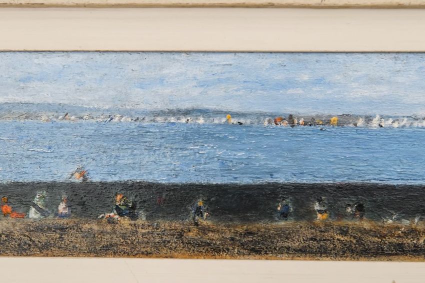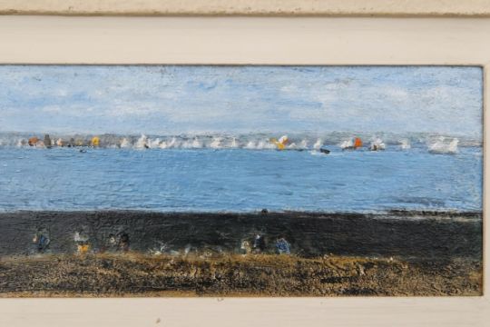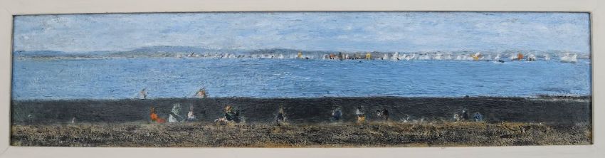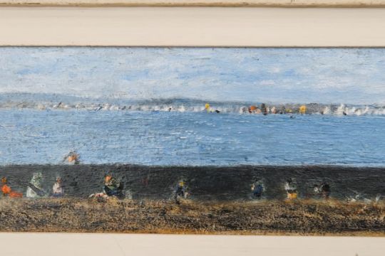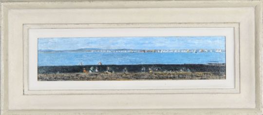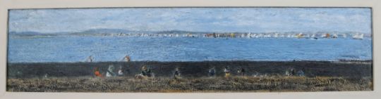 'Dark Beach' 1986, oil on board, inscribed verso: 'Dark Beach, Richard Eurich RA 1986', also with The Fine Art Society label to reverse, framed
