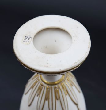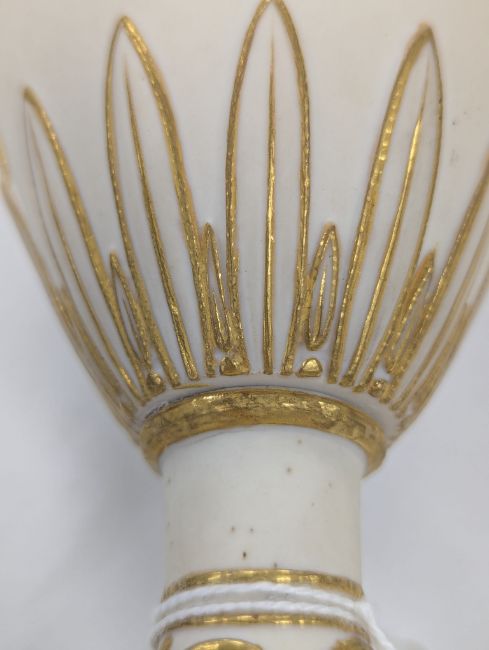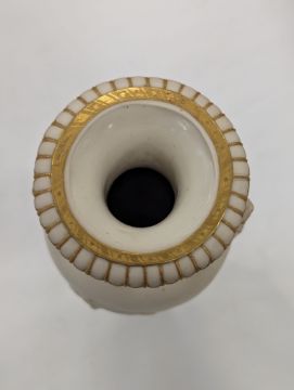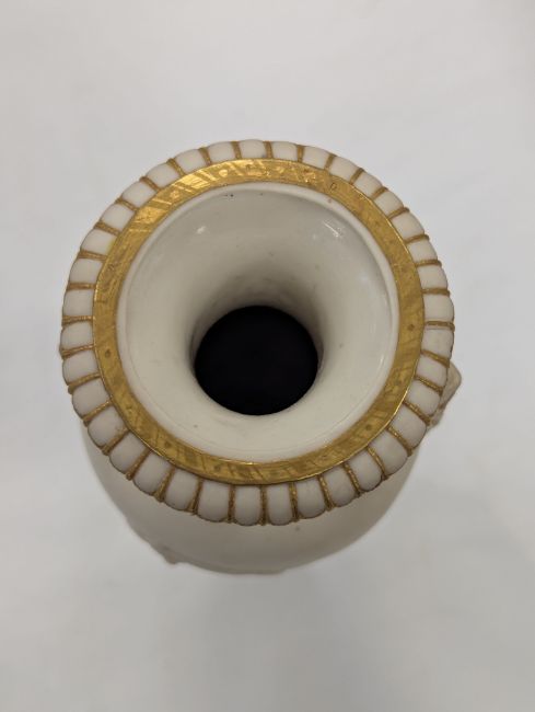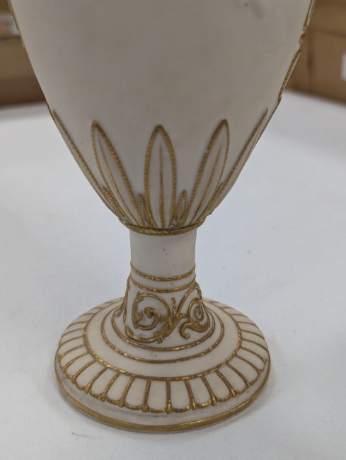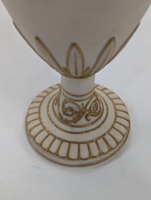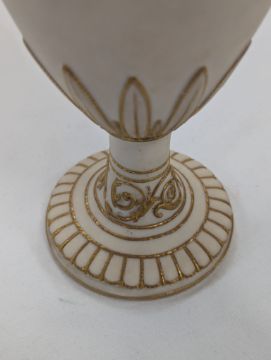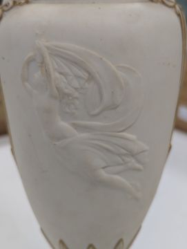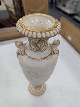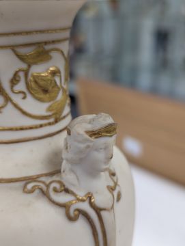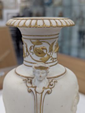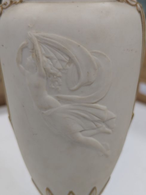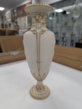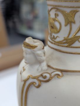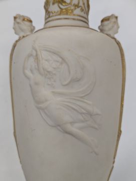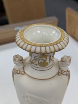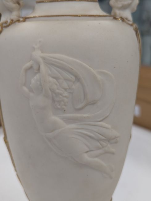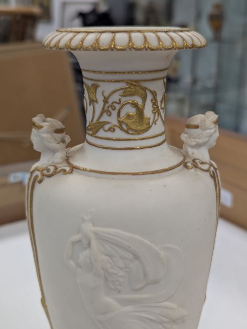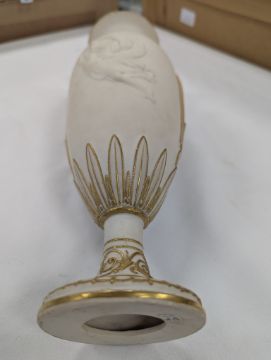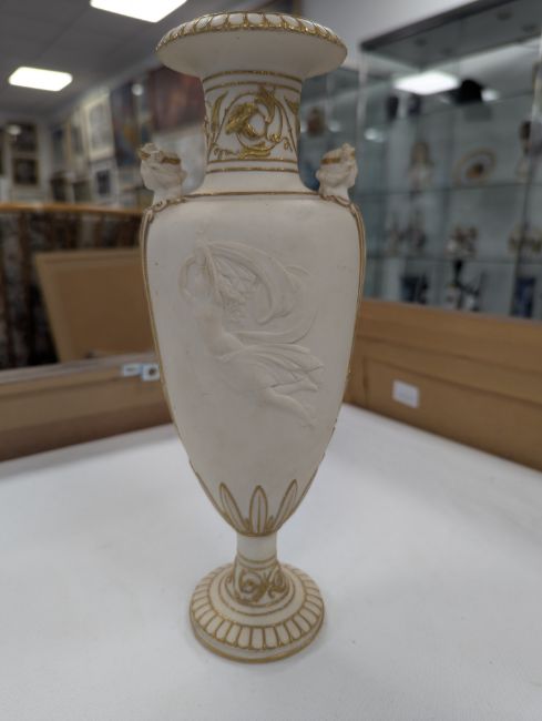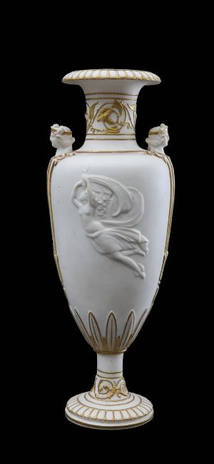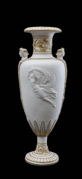 19th century, modelled as an amphora, with a gilt rim and foliate neck, the handles modelled as maiden heads, the body relief decorated with a Greek nude holding a lekythos, the base impressed mark 'W.H.Goss'