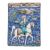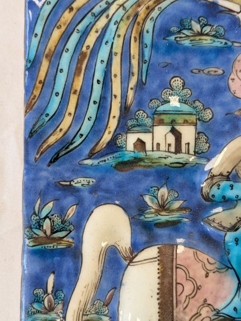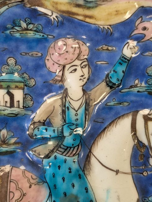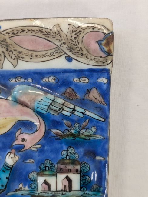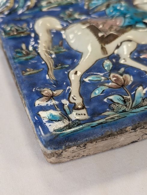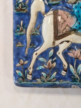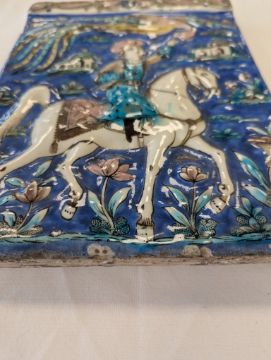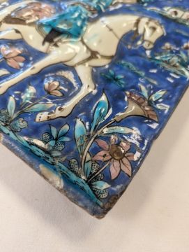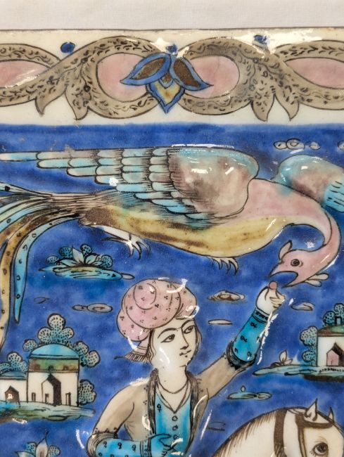 early 19th century, Tehran, Iran, the moulded and polychrome decoration depicting a scrolled foliate border, above an equestrian rider or horseman wearing a turban, with an outstretched arm feeding a phoenix, possibly the Persian mythological bird, Simurgh, before buildings, flowers and vegetation, to a cobalt blue ground