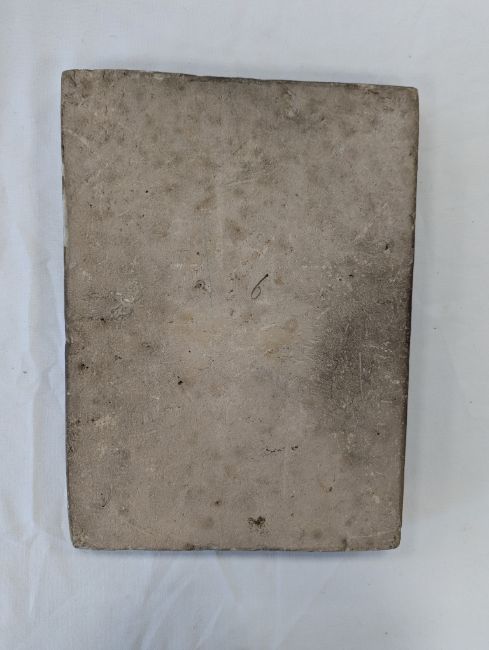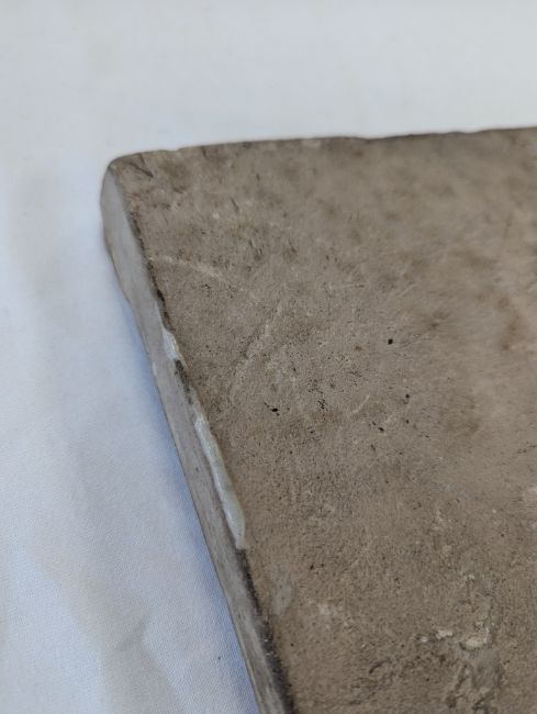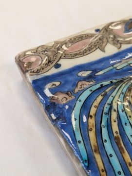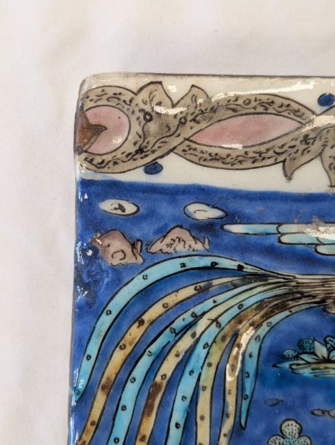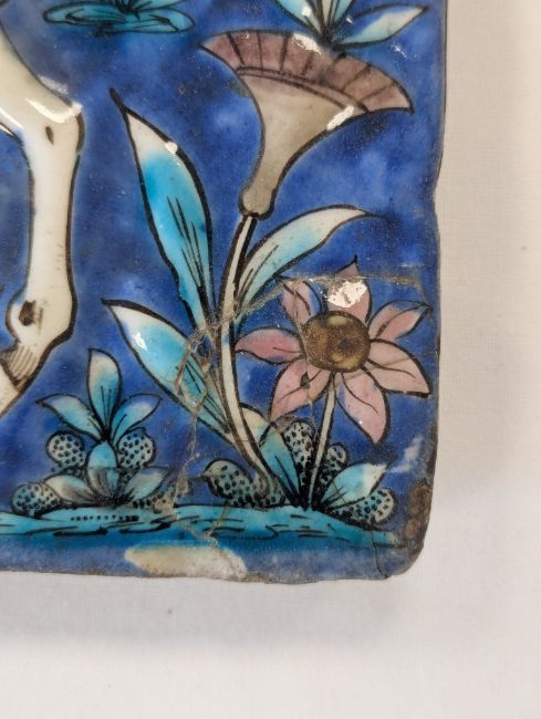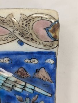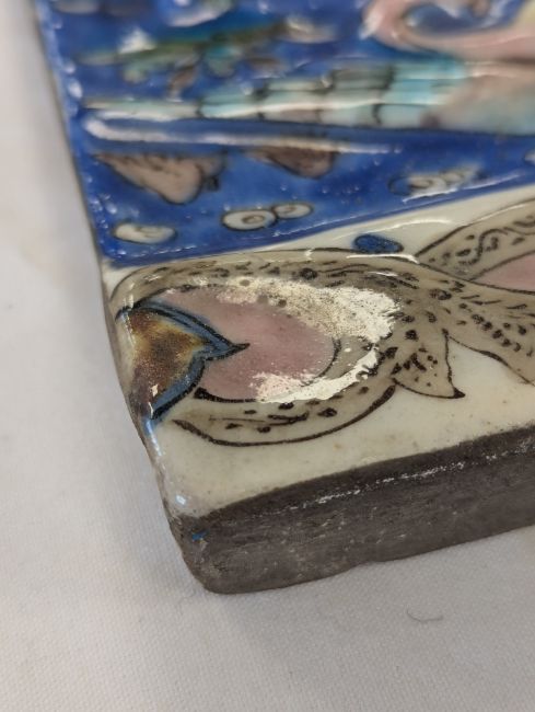 Condition: The bottom right hand corner has been cracked and restored. Chips to the base. Possible over painted chip to the top left hand edge, but it does not fluoresce under UV light so may have occurred during firing or manufacturing.